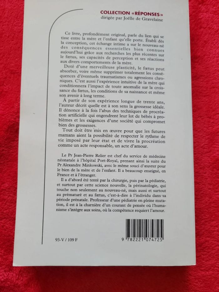 Ce livre, profondément original, parle du lien qui se tisse entre la mère et l'enfant qu'elle porte. Etabli dès la conception, cet échange intime a sur le nouveau-né des conséquences essentielles bien connues aujourd'hui grâce aux recherches les plus récentes sur le fœtus, ses capacités de perception et ses réactions aux divers comportements de la mère. Doté d'une merveilleuse plasticité, le fœtus peut absorber, voire même supprimer totalement les conséquences d'éventuels traumatismes ou agressions chroniques. C'est aussi l'expérience, intuitive de la mère qui conditionnera l'impact de toute anomalie sur la croissance du fœtus, les conditions de sa naissance et même son avenir à long terme. A partir de son expérience longue de trente ans, l'auteur décrit quelle est à son sens la grossesse idéale. Il dénonce à la fois l'abus des techniques de procréation artificielle qui engendrent, leur lot de bébés à problèmes et les exigences d'une société qui compromet bien des grossesses. Tout doit être mis en œuvre pour que les futures mamans aient la possibilité de respecter le rythme de vie imposé par leur état et de vivre la procréation comme un acte responsable, un acte d'amour. Très bon état Envoi rapide et soigné