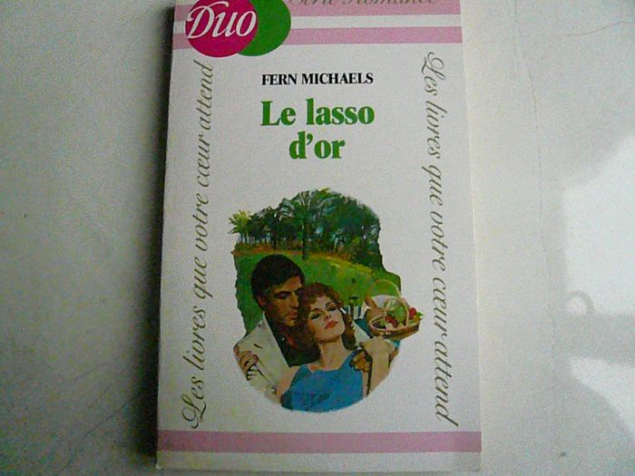 Livre de Fern Michaels « Le lasso d’or » Série Romance Résumé : Lorsque Janice a hérité du ranch Arroyo, elle a bien cru que c'était la fin de tous ses ennuis. Mais elle a compté sans la volonté de possession de Derek Bannon… - Tout n'est pas à vendre, monsieur Bannon ! Pas plus moi que le ranch Arroyo. Derek Bannon se penche par-dessus le bureau. Doucement, il lui prend le visage et l'attire vers lui. - Tout est à vendre si on y met le prix, dit-il d'une voix impassible. Le beau rêve de Janice va-t-il tourner au cauchemar ? Neuf.