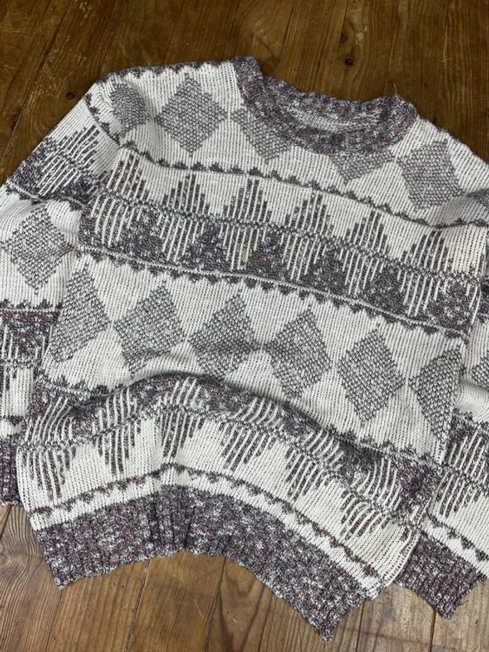 Pull maille vintage coton motifs carreaux blanc gris Made in USA L - photo numéro 1