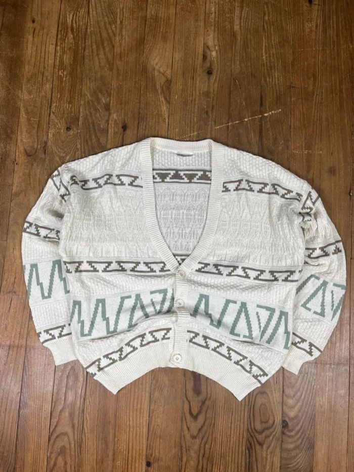 Pull cardigan maille vintage coton motifs rayures blanc M