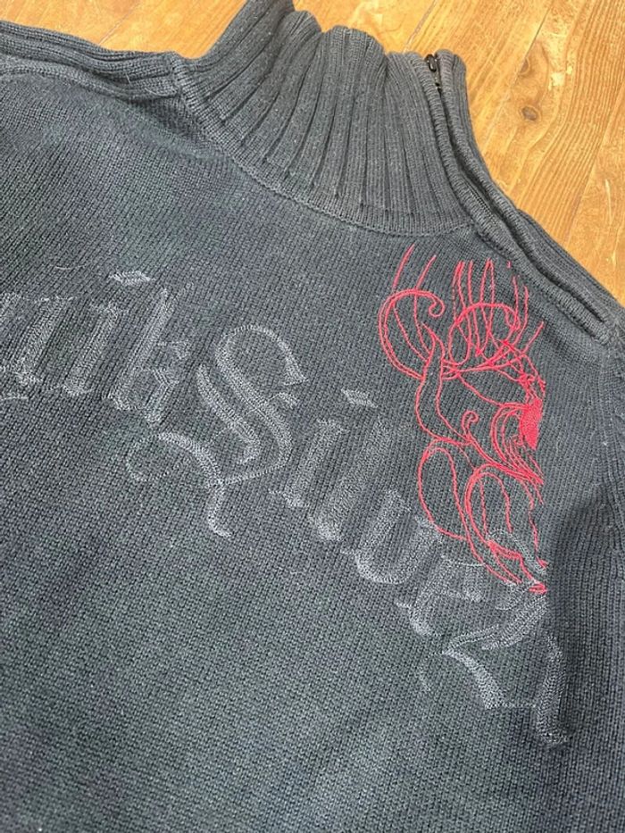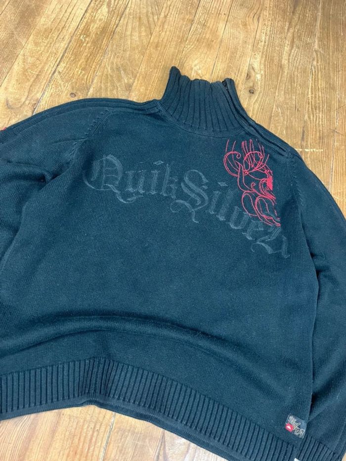 Pull maille zip vintage Y2K Surfwear Quiksilver noir brodé XL coton