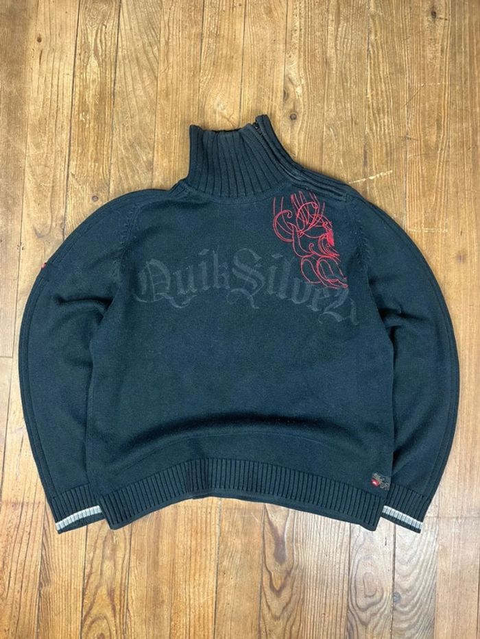Pull maille zip vintage Y2K Surfwear Quiksilver noir brodé XL coton - photo numéro 1