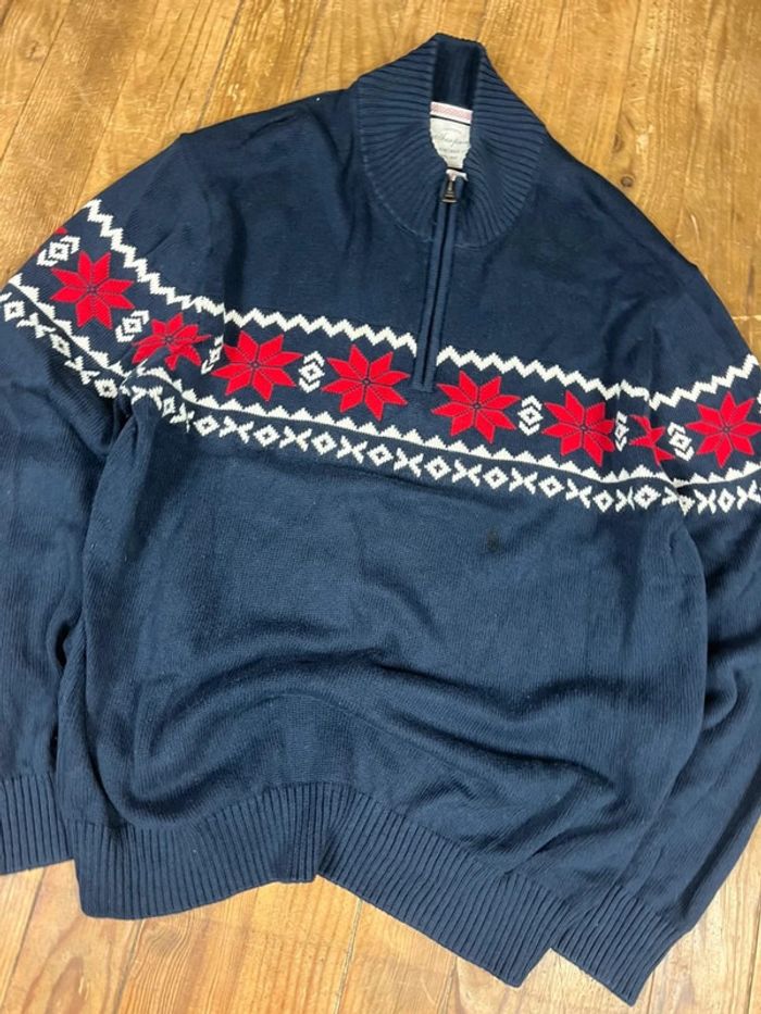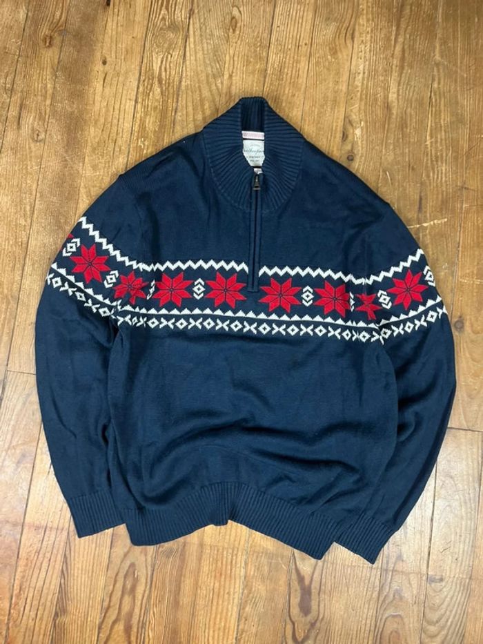 Pull maille vintage 100% coton 1/4 zip motifs marine blanc rouge XXL - photo numéro 1