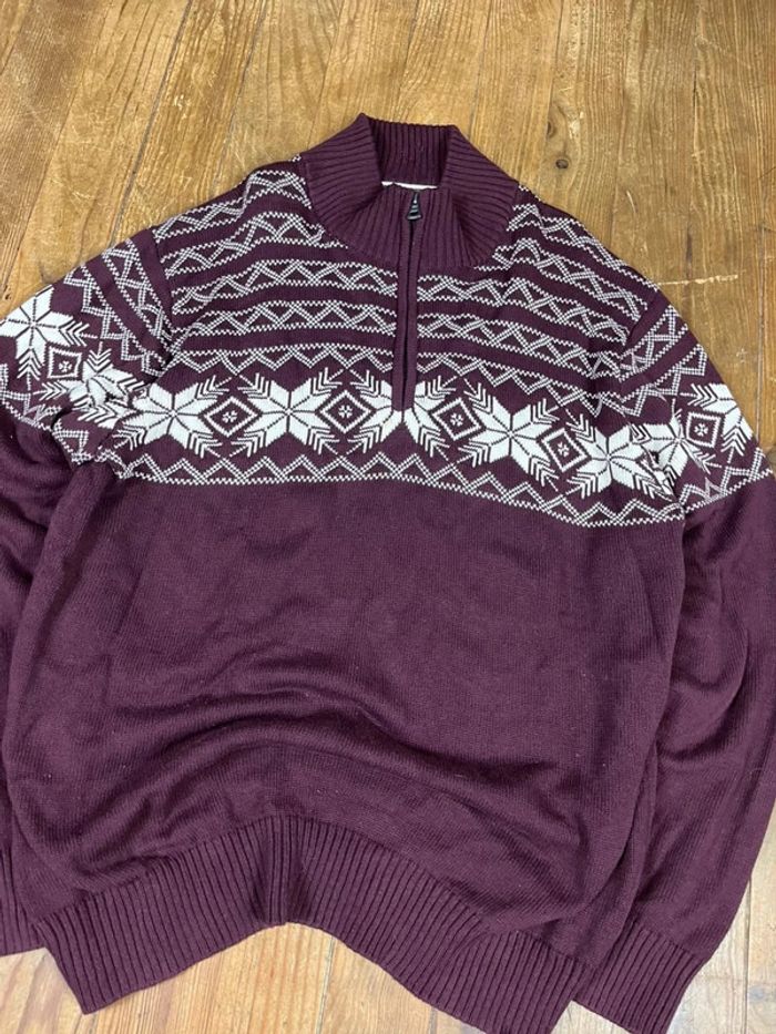 Pull maille vintage 100% coton 1/4 zip motifs bordeaux blanc 2XL XXL