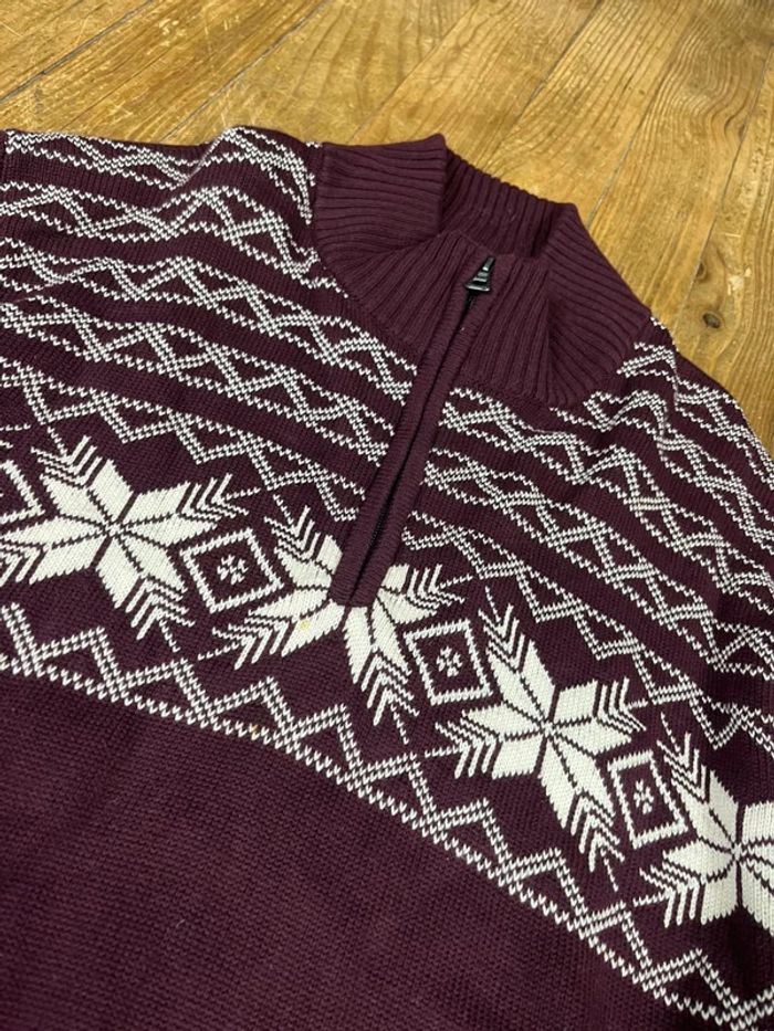 Pull maille vintage 100% coton 1/4 zip motifs bordeaux blanc 2XL XXL - photo numéro 1