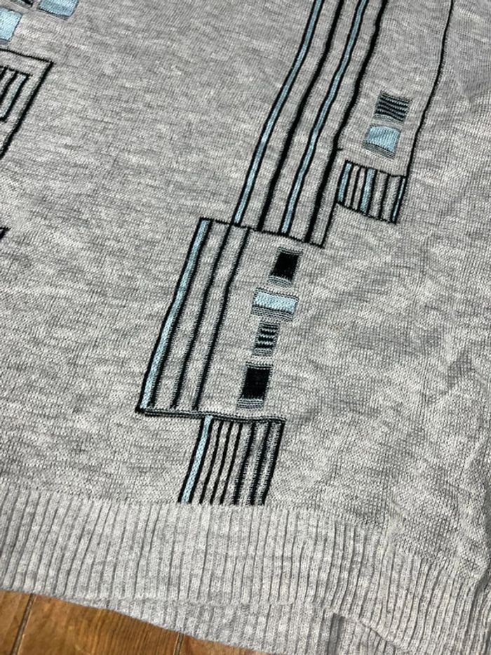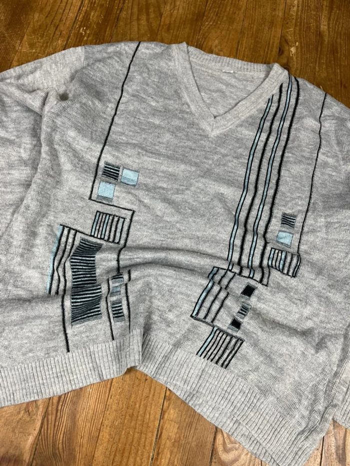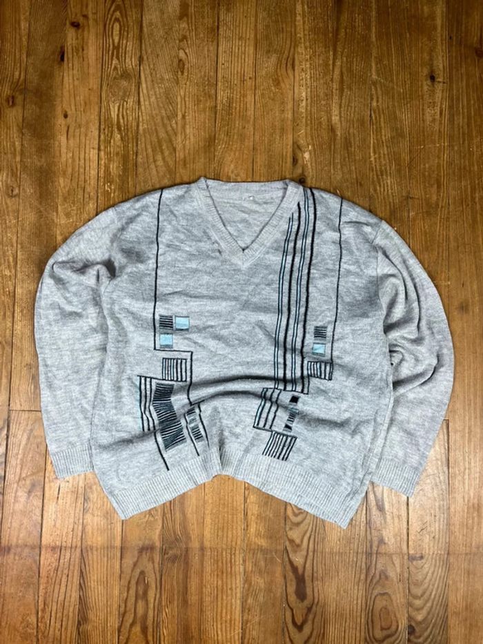 Pull maille vintage col V motifs rayures gris noir bleu clair XL - photo numéro 1