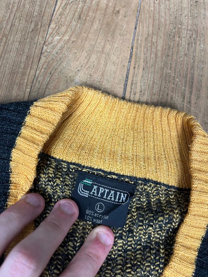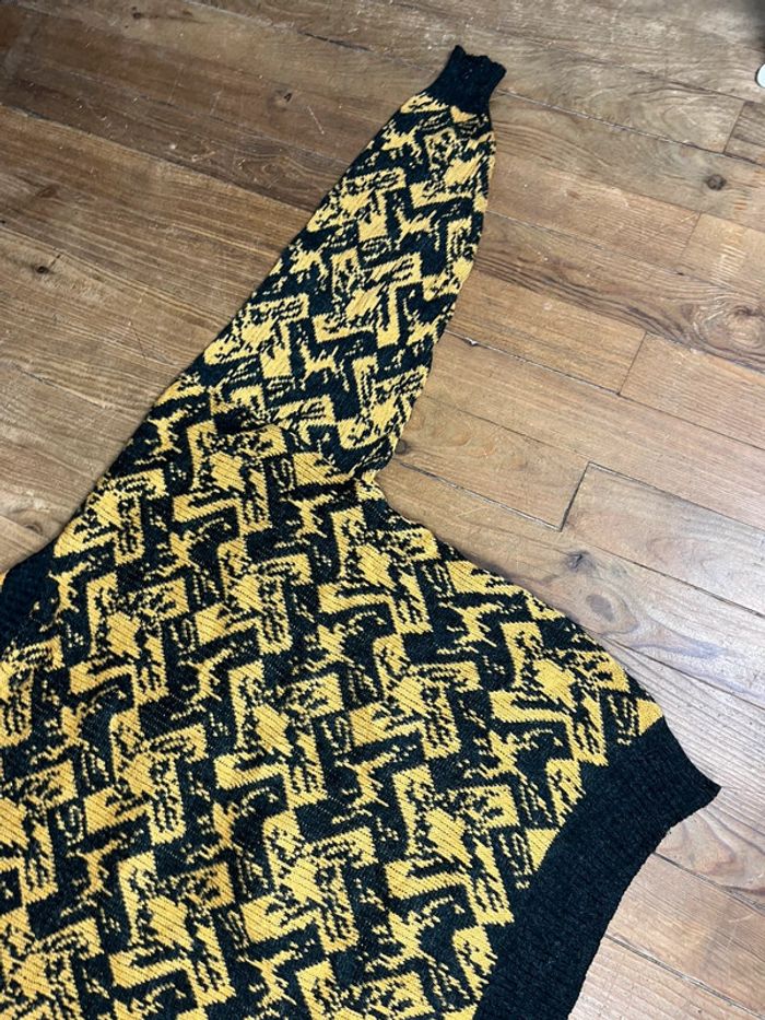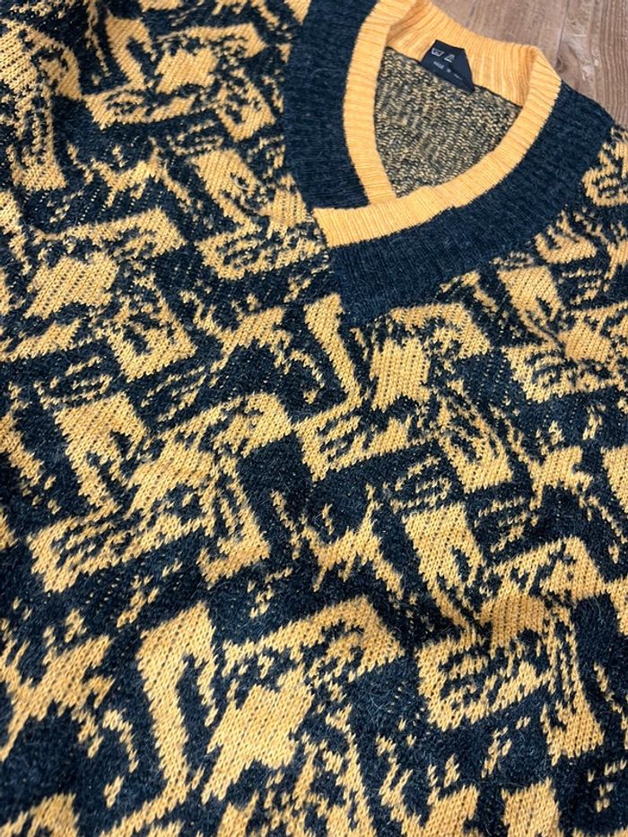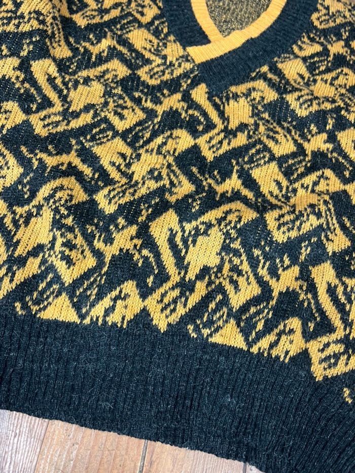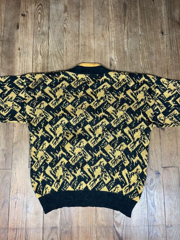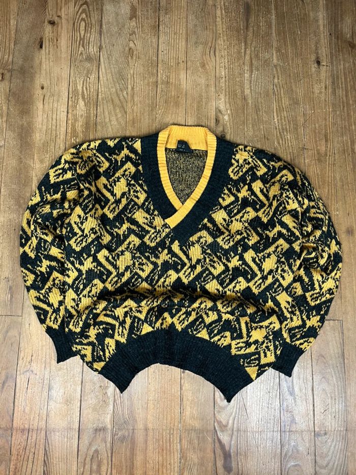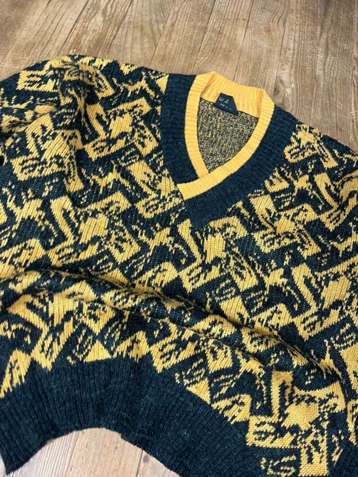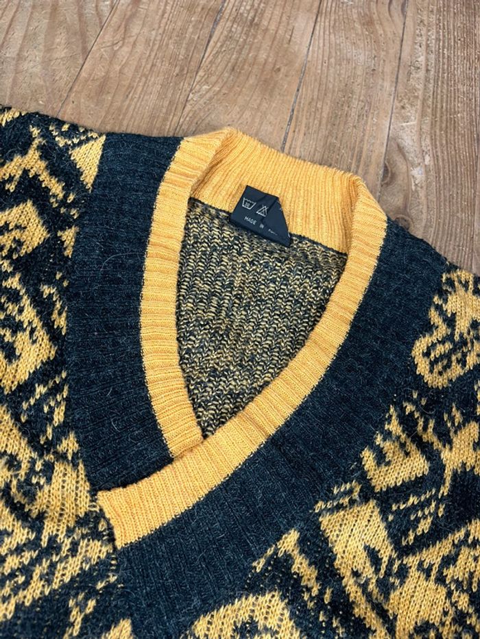 Pull maille vintage col V laine motifs moutarde noir L - photo numéro 1