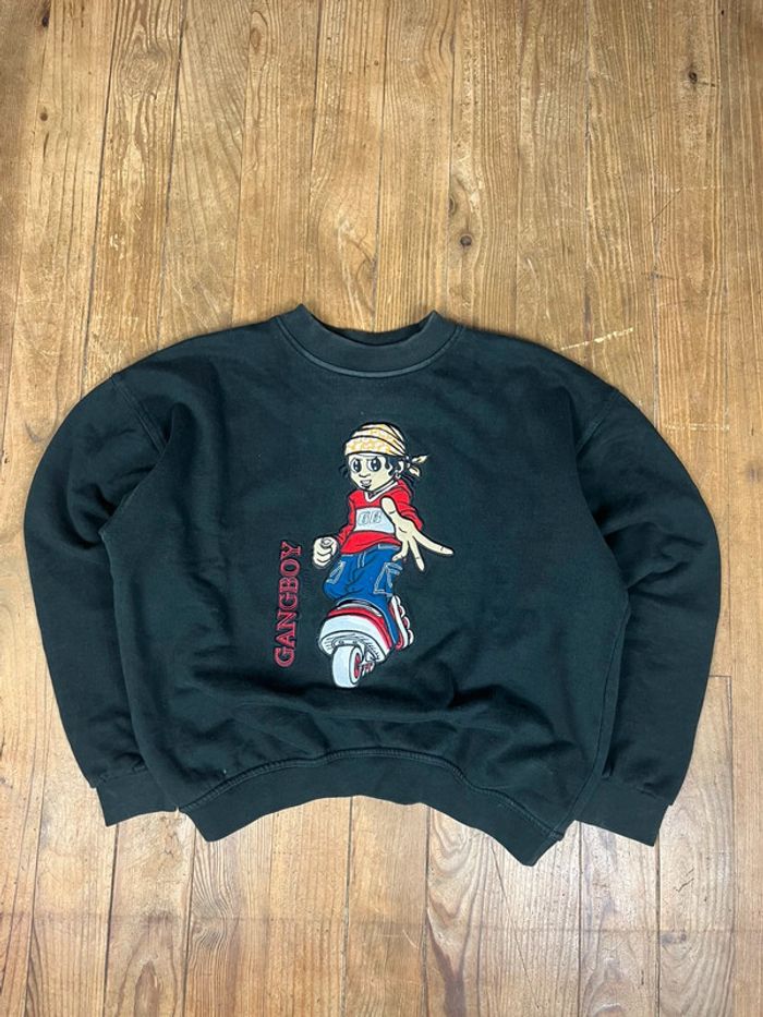 Sweat crewneck / pull vintage Y2K Hip-Hop brodé GangBoy S noir 100% coton