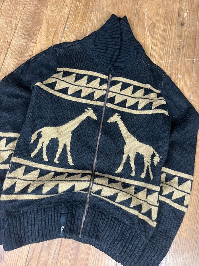 Pull cardigan zip-up vintage maille laine rayures motifs girafes animaux S