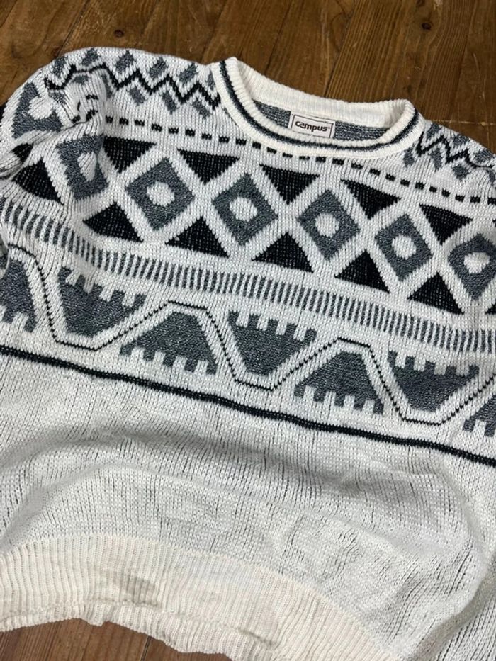Pull maille vintage motifs rayures blanc noir gris Made in USA L - photo numéro 1