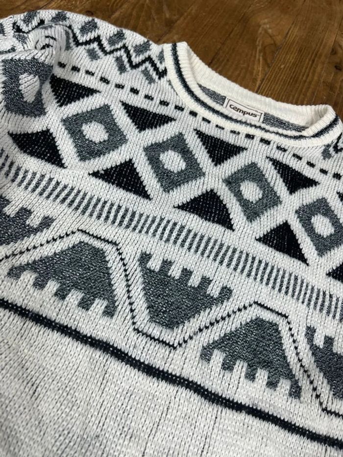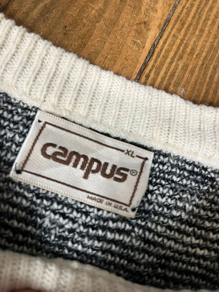 Pull maille vintage motifs rayures blanc noir gris Made in USA L