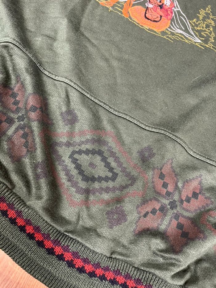 Pull / sweat vintage vert foncé brodé personnages paysages M - photo numéro 10