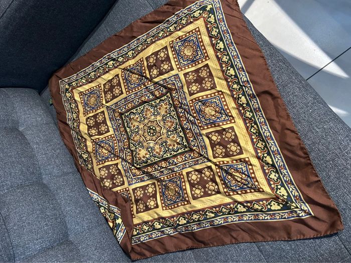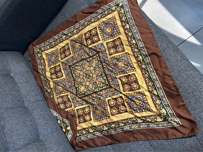 Grand foulard en soie à dominante marron - dimensions : 65 cm x 65 #foulard #foulardsoie