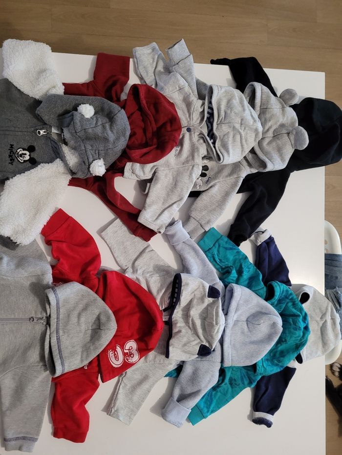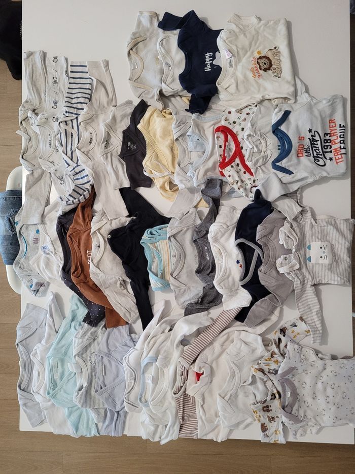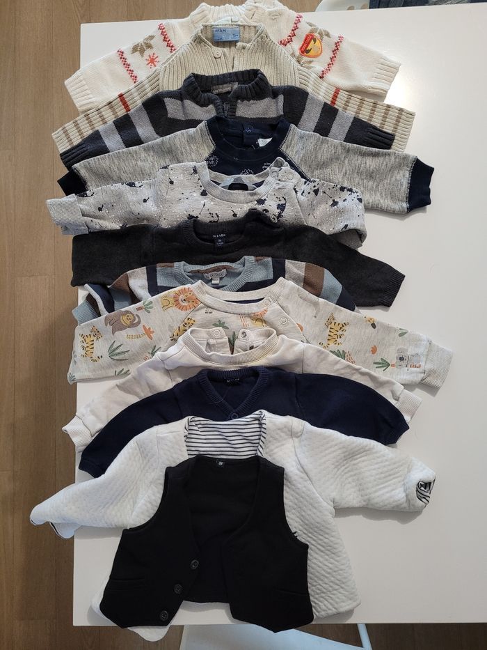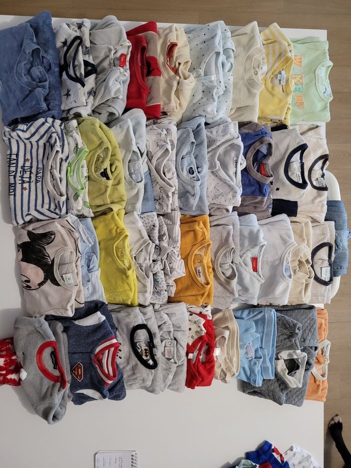 Bonjour, je vends un gros lots de vêtements taille 3 mois garçon - pulls ou vestes (sans capuche) => 12 pièces - pulls ou vestes ( avec capuche) => 11 pièces - bodys => 42 pièces - t-shirts manche longue => 22 pièces - t-shirts manche courte => 9 pièces - pantalons => 24 pièces - manteau => 1 pièce - salopettes => 6 pièces - pyjamas => 39 pièces TOTAL => 166 pièces je vends ce lots 150€ (prix négociable dans la limite du raisonnable) Cordialement