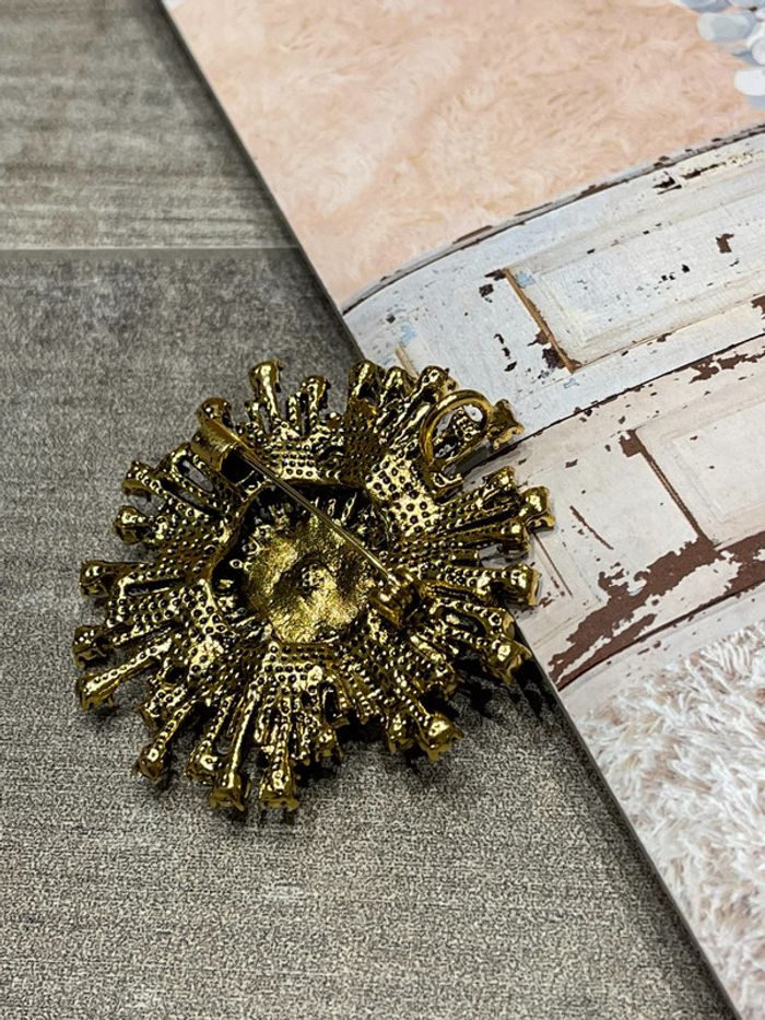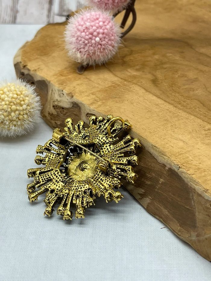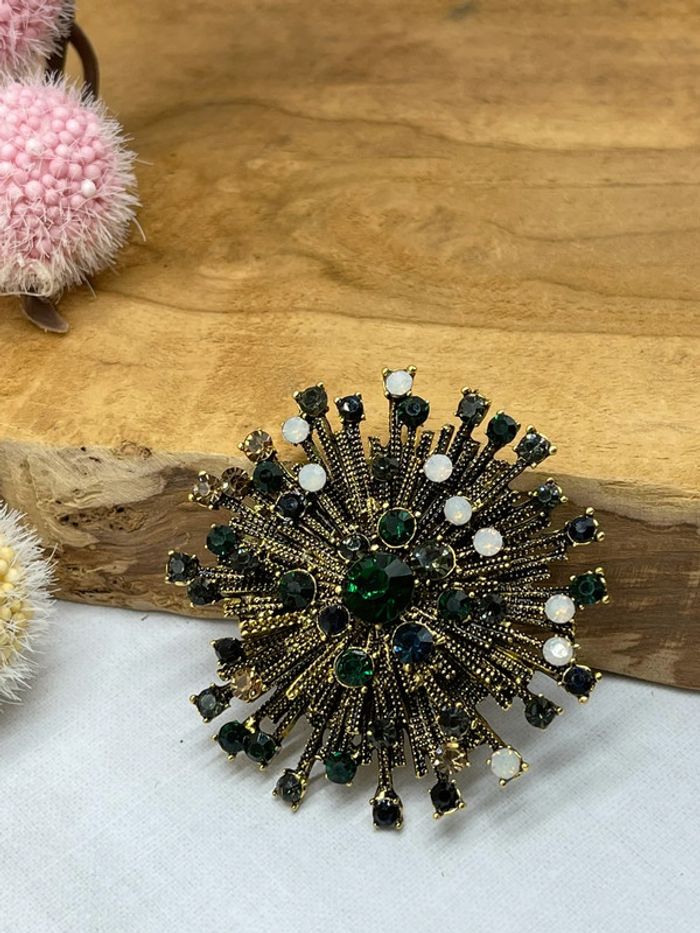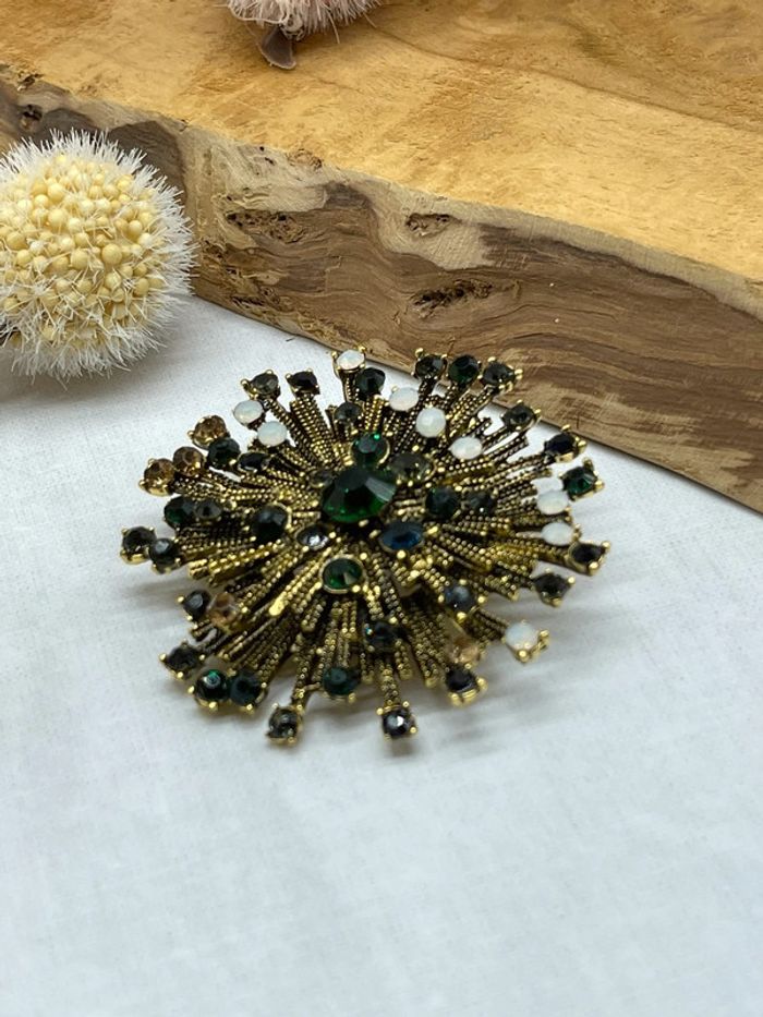 broche fantaisie en excellent état neuve peut se transformer en pendentif pour avoir un joli sautoir avec strass au centre en vert foncé et strass autour en marine, vert, nude, pierre de lune …. très jolie idée cadeaux