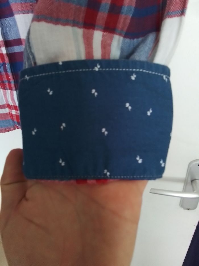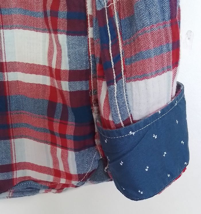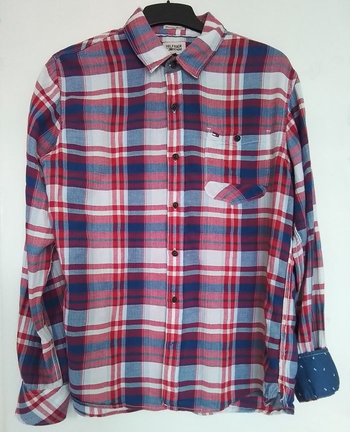 Superbe chemise manches longues à rayures. Hilfiger Denim. Motifs aux poignets. 1 poche. Bleu, rouge, blanc. Taille XL. 99% coton, 1% elastane. Propre en très bon état.