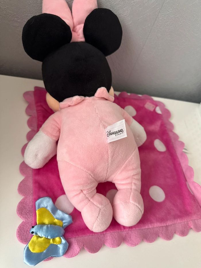 Adorable doudou Minnie rose sur sa couverture à pois blancs, issu de Disneyland Paris 🐭💖 ✨ Très doux et moelleux 🎀 Couverture rose à pois + papillon cousu 📍 Produit Disney officiel (étiquettes visibles) 🌸 Parfait pour bébé ou en cadeau de naissance 💡 Très bon état général – lavé et propre 🚫 Maison non fumeur, pas d’animaux 📦 Envoi rapide et soigné 🎁 Possibilité de regroupement avec d’autres articles bébé