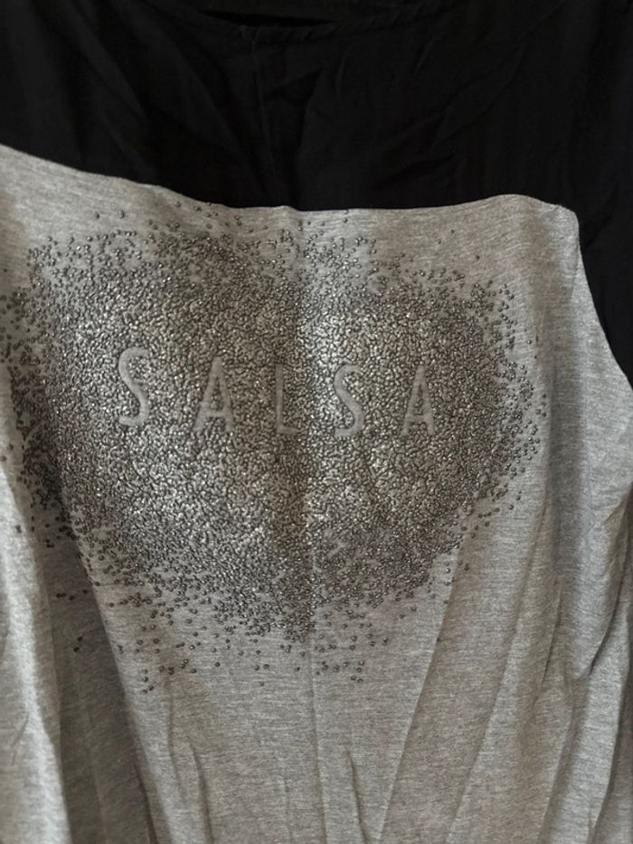Haut bicolore original de la marque Salsa, taille M. Manches longues et haut du dos noirs, corps gris chiné avec logo SALSA incrusté de petites perles brillantes en forme de cœur. 💎 Détail chic : effet pailleté très subtil 📏 Taille : M 🧵 Matière : mélange coton/viscose (non précisé sur l’étiquette visible) 🧺 État : Très bon état, très peu porté 🎯 Style casual chic, parfait avec un jean