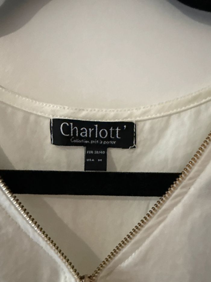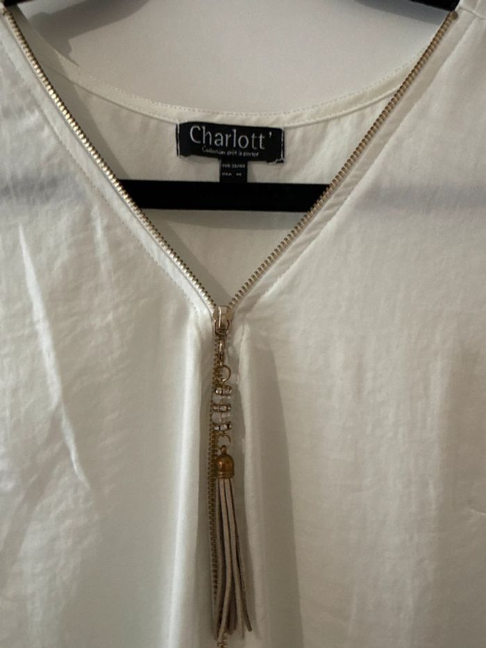 Top fluide et chic de la marque Charlott’, taille EUR 38/40 (M). Coupe droite légèrement évasée, tissu fluide et agréable, zip doré décoratif avec pampille et strass sur le devant. Dos légèrement plus long pour un tombé élégant. 🧵 Matière : fluide, léger et doublé à l’avant 📏 Taille : 38/40 – M 🎯 Style : habillé, parfait pour le travail ou une tenue de soirée 🧺 État : Très bon état Facile à associer avec un jean, un pantalon de tailleur ou une jupe !