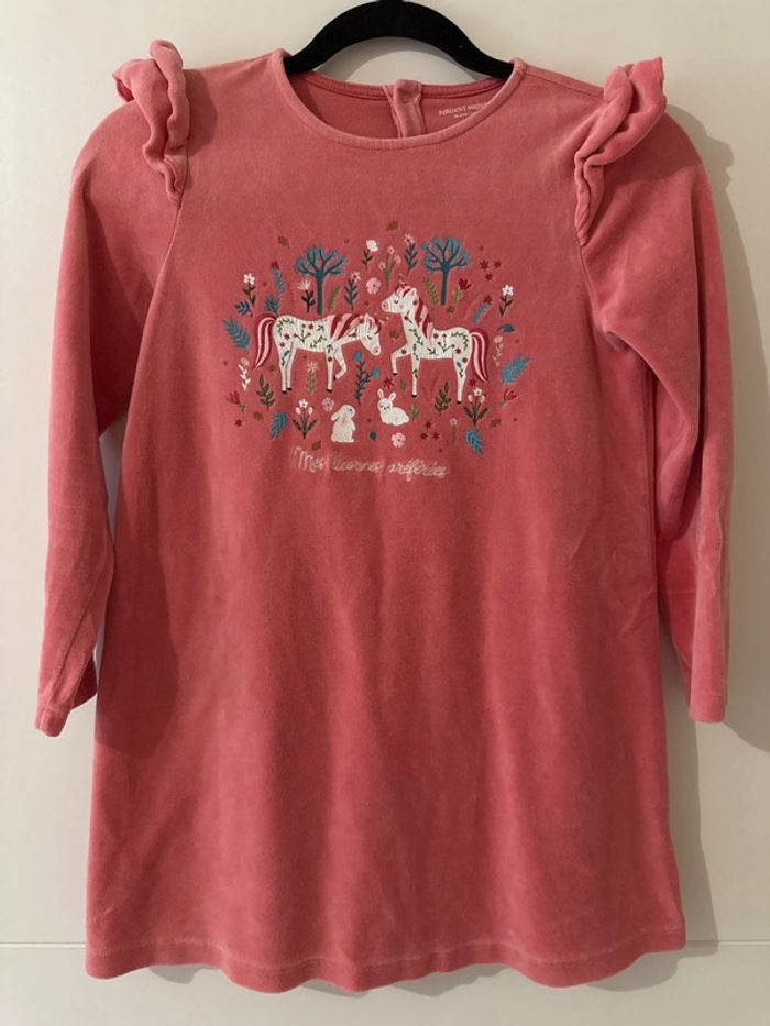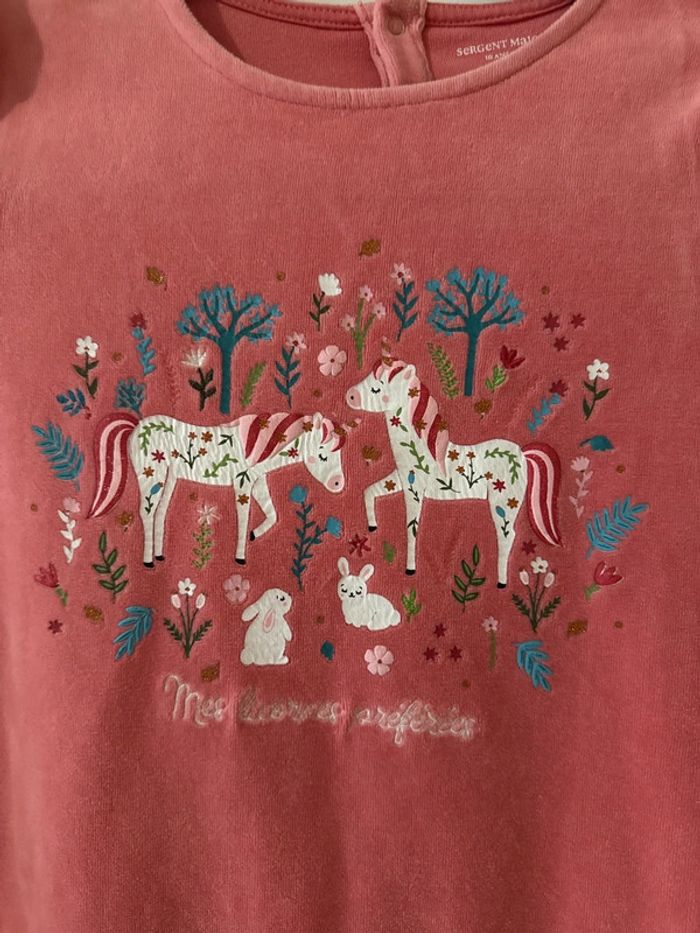 Adorable robe de chambre en velours Sergent Major, idéale pour les soirées cocooning ou les matinées fraîches. Taille 10 ans / 140 cm. 🩷 Détails : • Matière velours douce et chaude • Couleur rose tendre • Jolis volants aux épaules • Motif brodé : licornes, lapins, fleurs et inscription Mes licornes préférées • Fermeture bouton au dos 🦄 Parfaite comme pyjama ou robe d’intérieur pour les petites fans d’univers féeriques ! 🔸 État : Très bon état, très peu portée. 📦 Envoi rapide et soigné 💬 Je reste dispo pour toute question !
