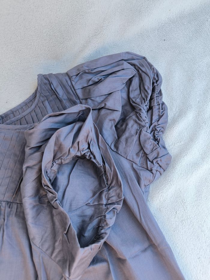Robe à manches courtes Marque Etam Taille 38 • Coloris gris • Fronces au col • Manches bouffantes et bas élastique • Effet satiné • Tissu fin • Petite tache sur le bas Largeur épaule à épaule non étirée : 31 cm Largeur épaule à épaule étirée au maximum : 39 cm Largeur aisselle à aisselle non étirée : 48 cm Largeur aisselle à aisselle étirée au maximum : 59 cm Longueur totale : 86 cm Longueur aisselle : 67 cm En très bon état #evelyne_taille_38