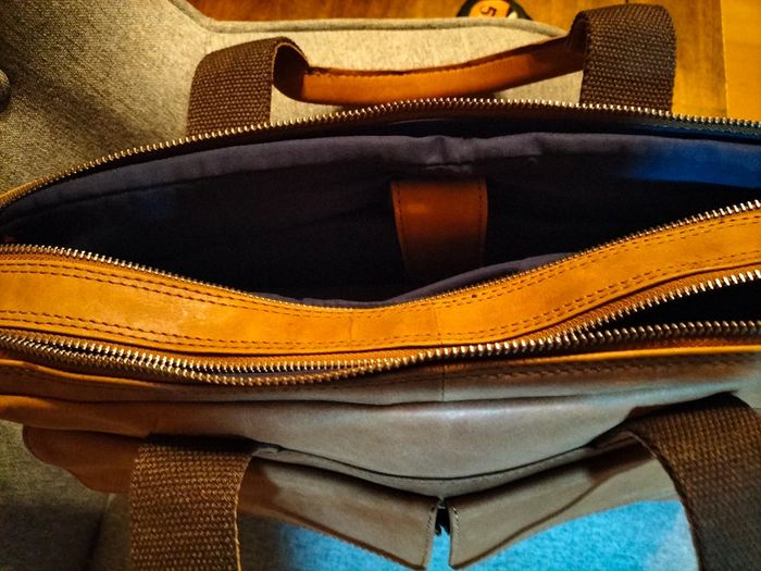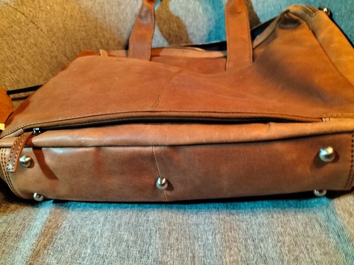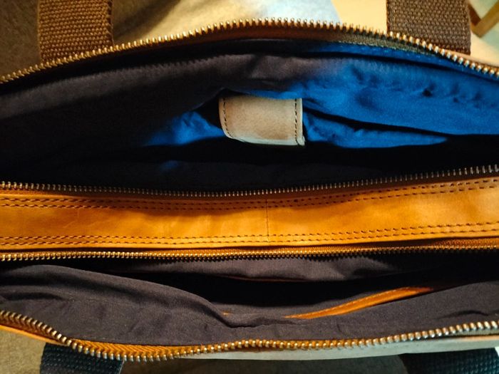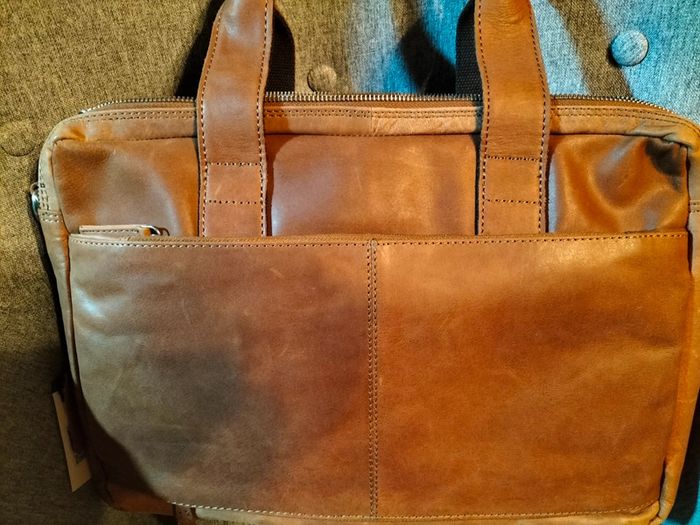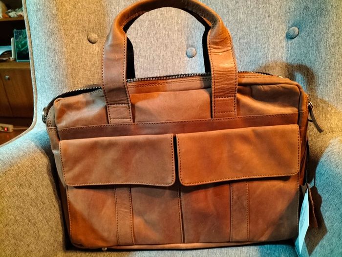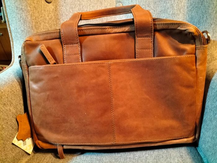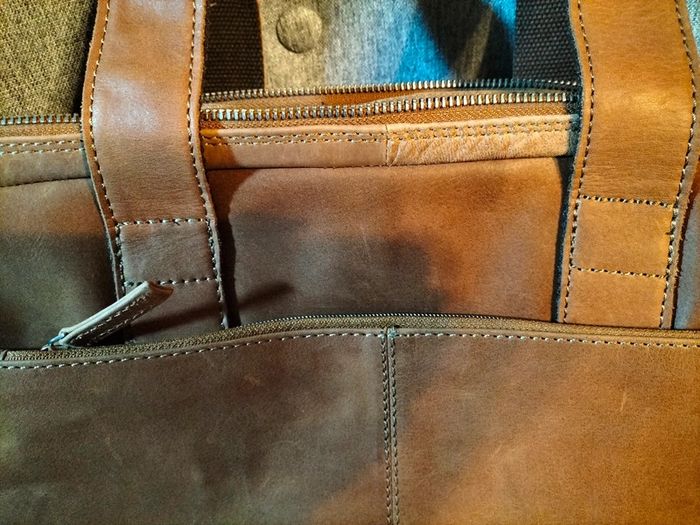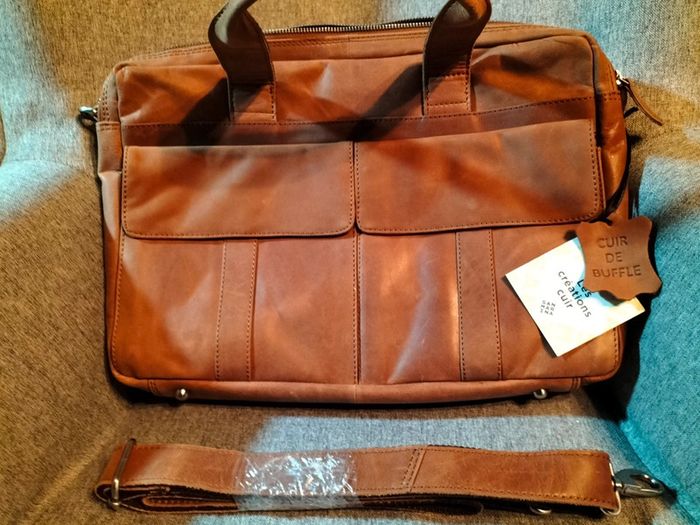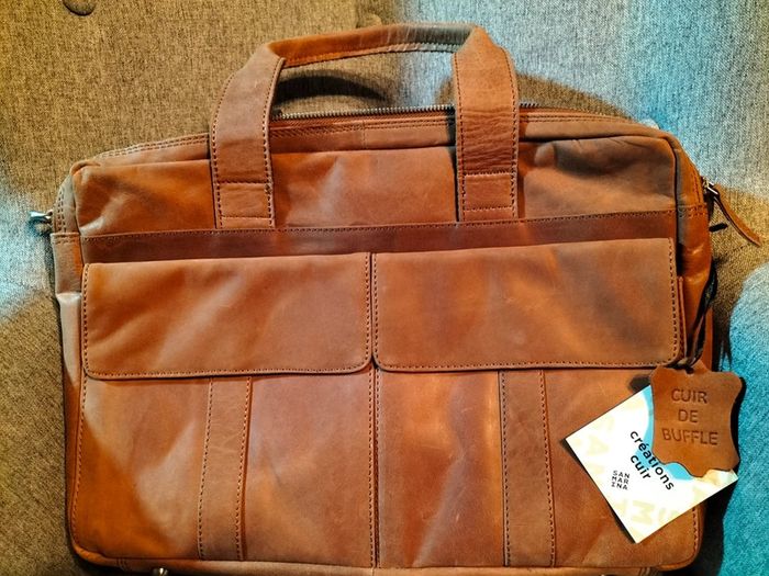 Sac porte documents en cuir de buffle Très belle qualité et finitions très soignées 100%cuir doublure polycoton Double compartiment p Fermeture zippée 2 poches plaquées sur le devant avec rabats 1 grande poche arrière zippée Peut se porter à la main ou en bandoulière Dimensions 40*28*7 cm