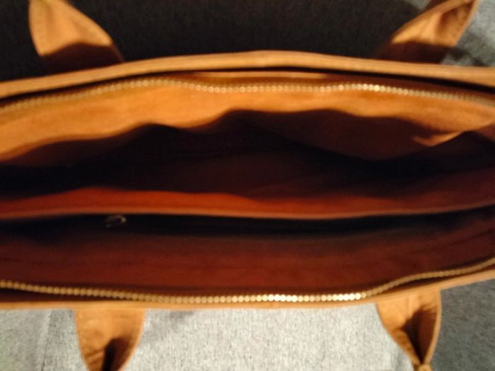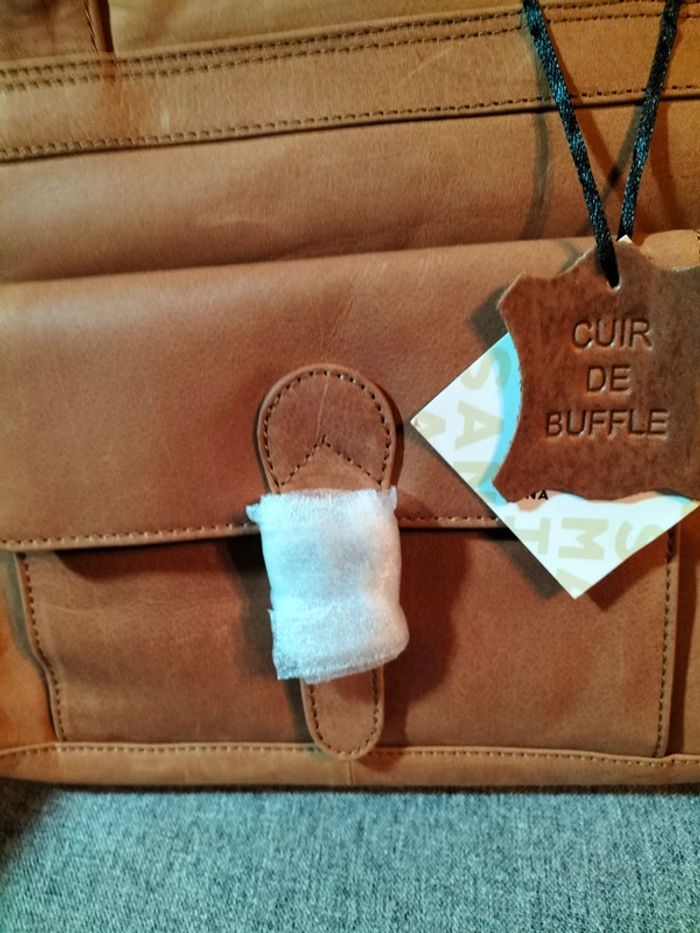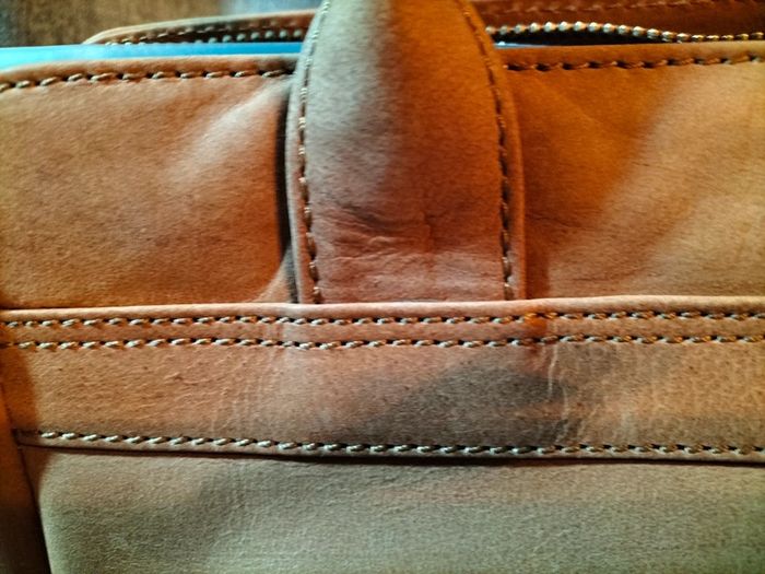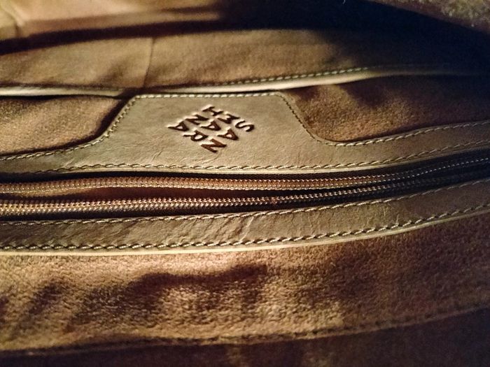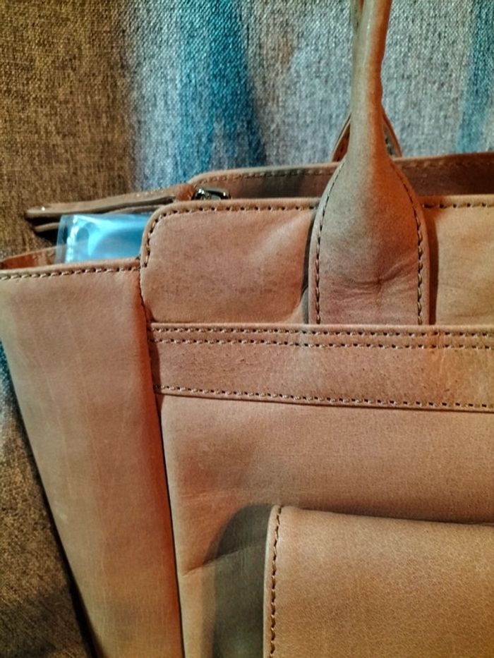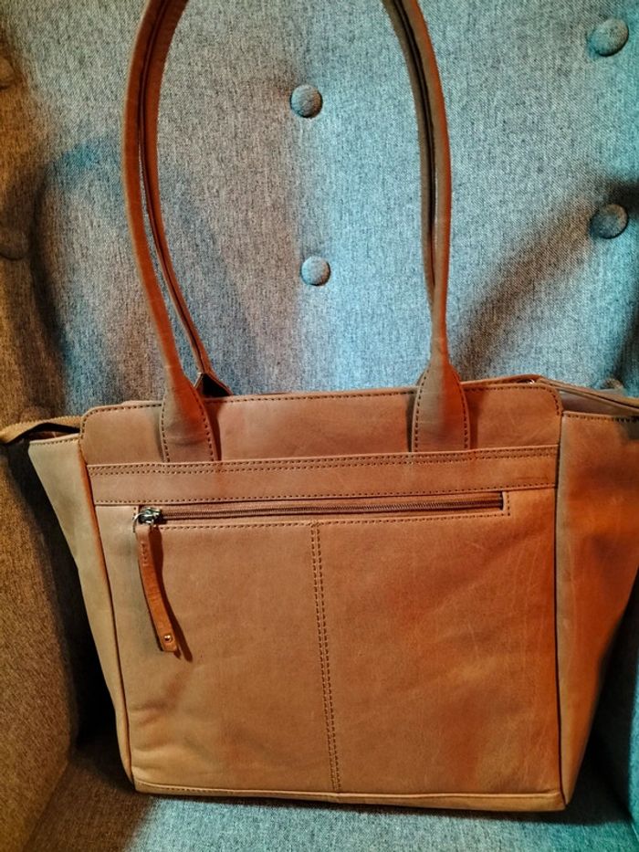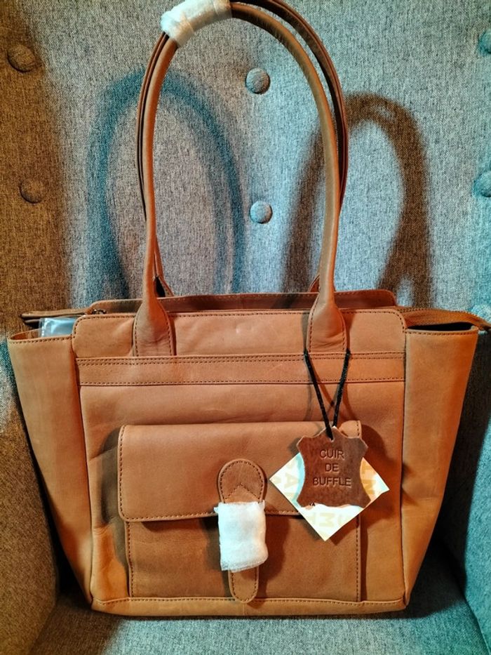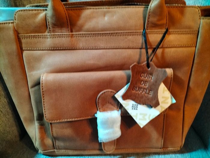 Très beau sac à main en cuir de buffle Collection : les créations cuir San Marina Finitions très soignées 1 grande poche ventrale avec une séparation ,poche plaquée avec fermeture éclair,,2 petites poches intérieures 1 poche à rabat sur le devant du sac Avec pression aimantée 1 poche plaquée sur l' arrière avec fermeture éclair Anses de portage Fermeture éclair pour fermeture du sac Dimensions hauteur 37 cm largeur en bas 28 cm,en haut 40 cm