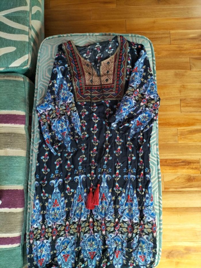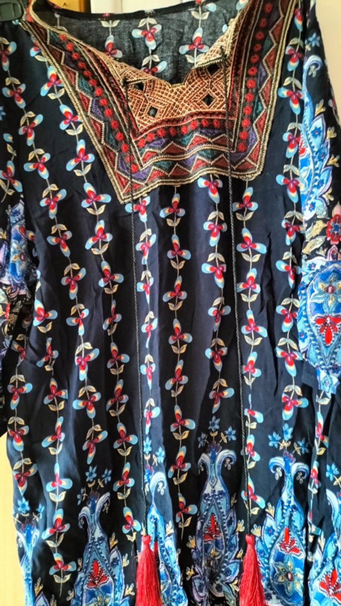 Robe d' été manches 3/ 4 Imprimé fleuri sur fond bleu Empiècement brodé Largeur épaules 38 cm Sous aisselles 50 cm Longueur 85 cm