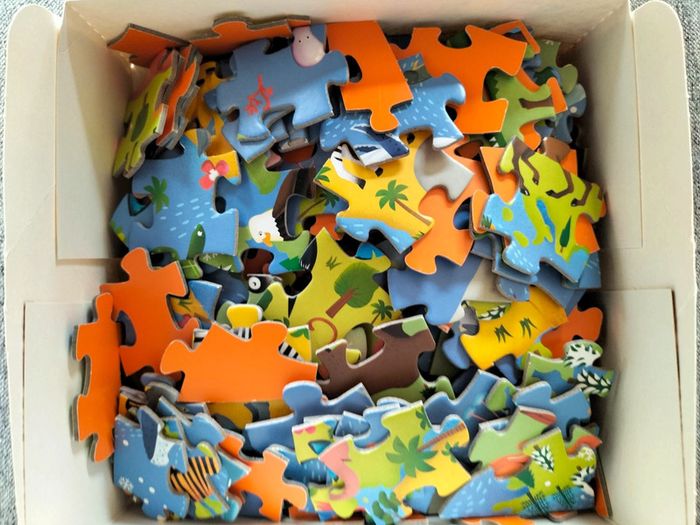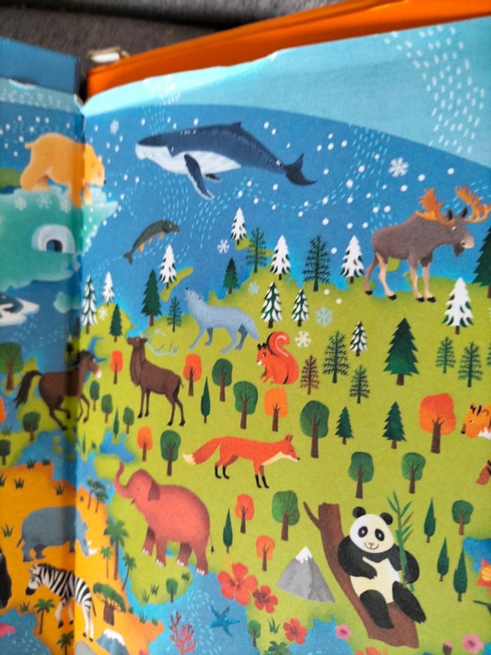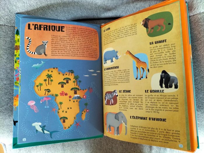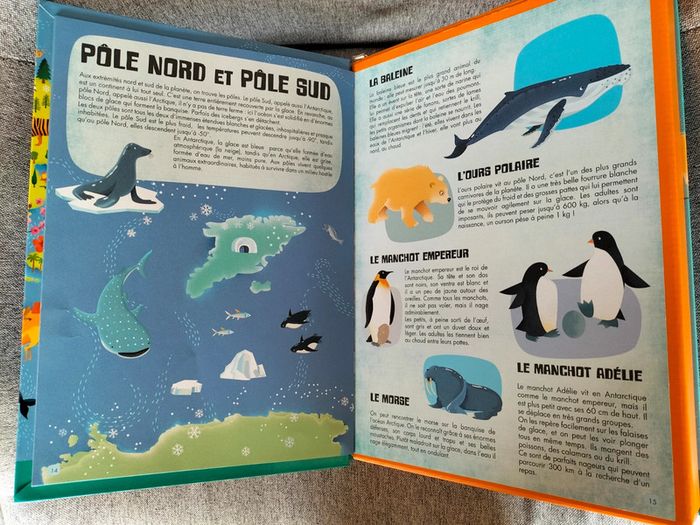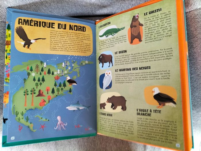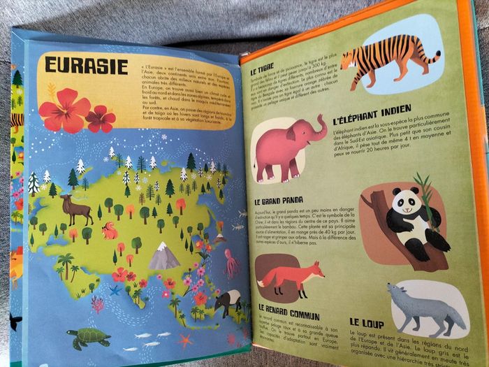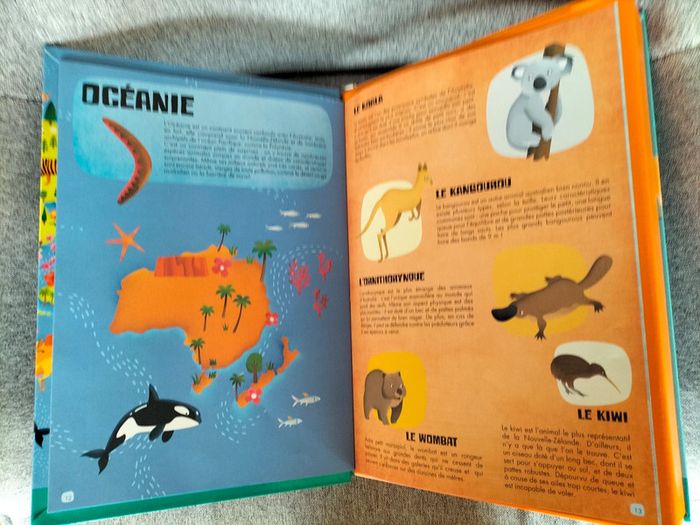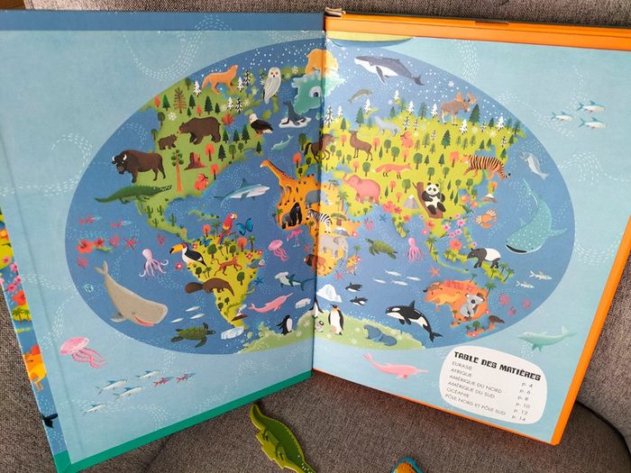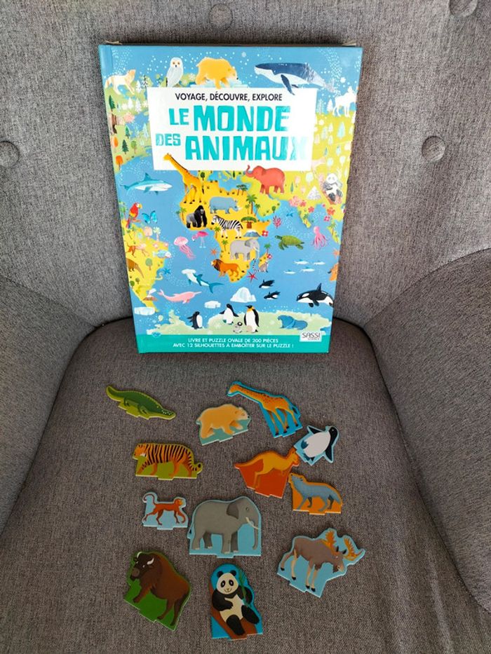 Le monde des animaux Livre et puzzle ( 79*48 cm) Avec 12 silhouettes à emboîter sur le puzzle Construis le puzzle ovale et découvre le plus curieux des animaux de chaque continent Dans le livre tu trouveras toutes leurs caractéristiques Très bon état et complet Il y a juste la première page du livre qui est un peu abîmée en haut ( cf photo)
