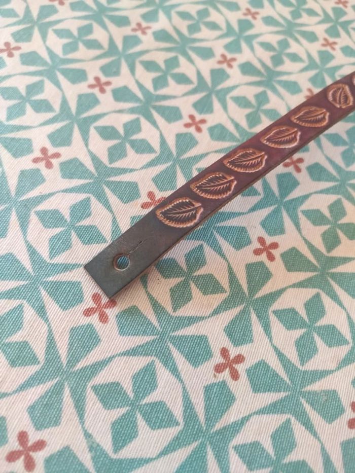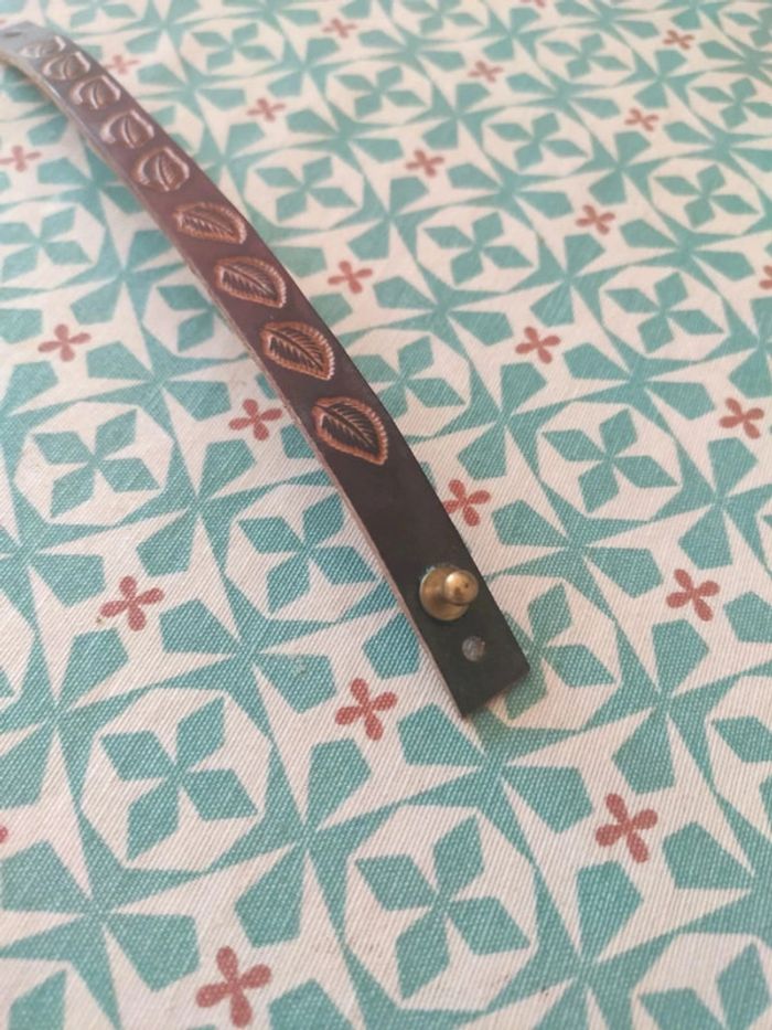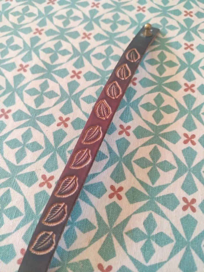 Acheté à Bobo-Dioulasso au Burkina Faso. Un bracelet en cuir avec des poinçons motifs feuilles. Dégradé violet et bleu. Longueur du bracelet entre le crochet et le trou : 17,5 cm. Bon état. #vulariBijoux