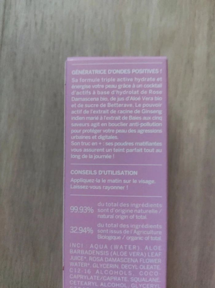 Crème éclat hydratante et matifiante. Formule bonne mine à base d'hydrolat de rose bio, de jus d'Aloe d'aloé vera bio et du sucre de betterave. 40 ml, label bio, 99,93 % d'ingrédients d'origine naturelle. Coûte 32 € en boutique