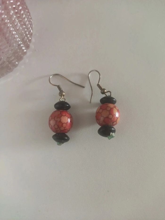 Très jolie boucles d'oreilles avec des perles en dégradé orange. Le fil qui tient les boucles est devenu un petit peu bleu, il faudra nettoyer. Diamètre de la perle orange 1,2 cm. #vulariBijoux