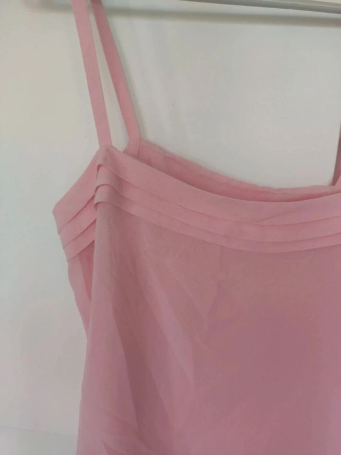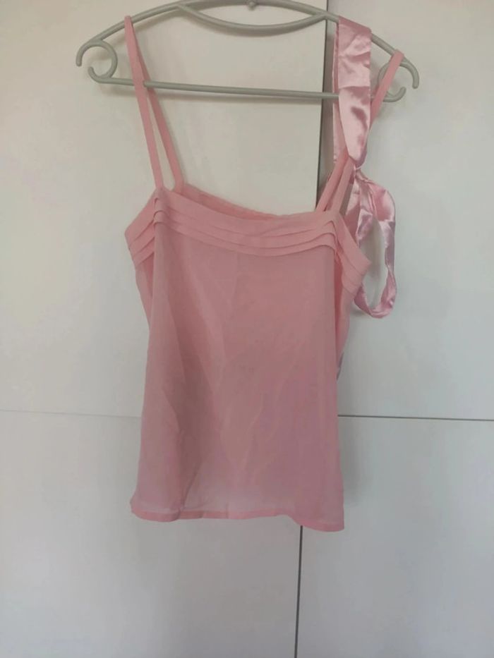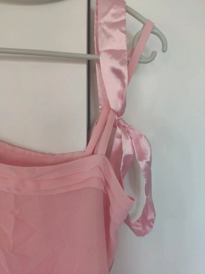 Top débardeur rose clair, assez transparent, avec des bretelles non réglables. Vendu avec un lien satiné rose à serrer a la taille, le.lien est un peu abîmé. Taille M