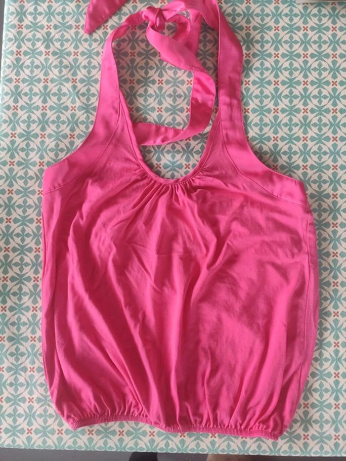 Tee shirt épaules dénudées couleur rose fuschia, élastiquée à la base et au niveau du dos, se ferme par un lien satiné derrière le cou, très bon état, acheté à La redoute, taille M #vulariFemmesM38 #vulariLaRedoute