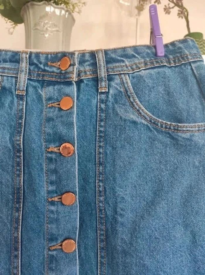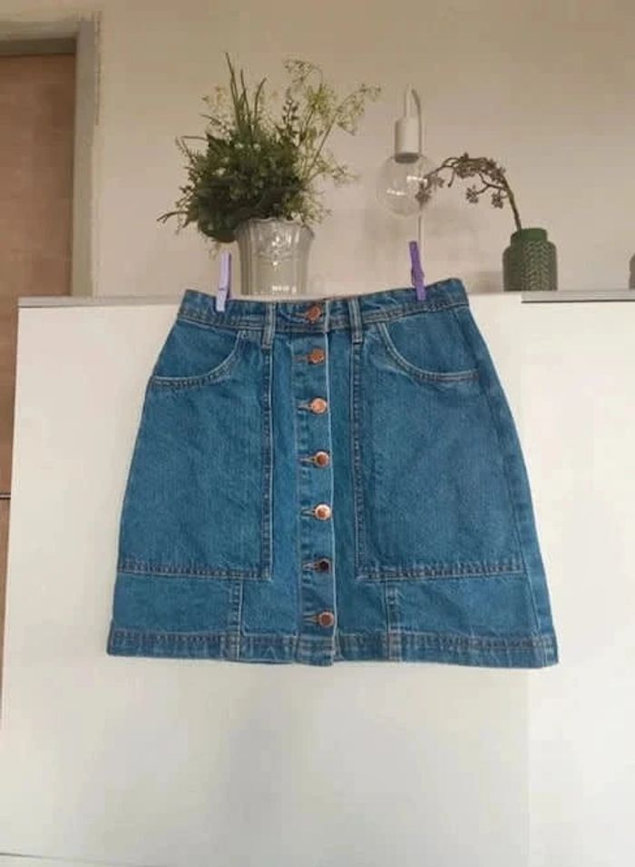 Jupe en jean entièrement boutonnée de haut en bas. 2 grandes poches et des passants pour ajouter une ceinture. Boutons assortis aux surpiqûres. Longueur de la jupe 40 cm. Taille 34. Achetée dans un magasin Stradivarius. Comme neuve, très très peu portée #vulariFemmesXS34 #vulariStradivarius