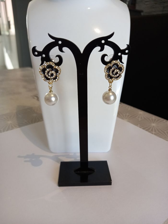 1 jolie paire de boucles d'oreilles motif fleurs et perles. Coloris doré, la fleur est noire sertit de strass blancs. Hauteur : 3,5 cms. Boucles neuves sous blister. N'hésitez pas à regarder mes autres. Envoi rapide et soigné.