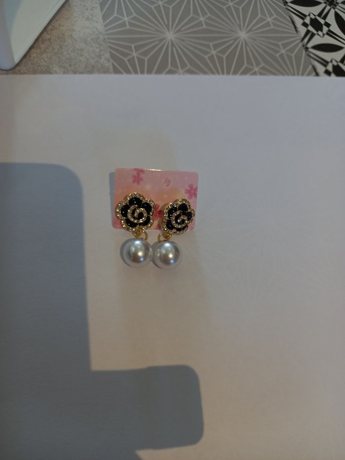 Boucles d'oreilles fleur perle noire dorée - photo numéro 2