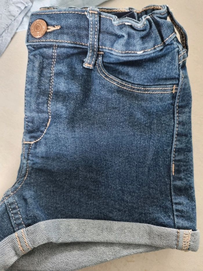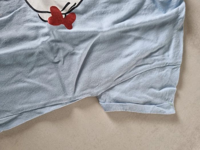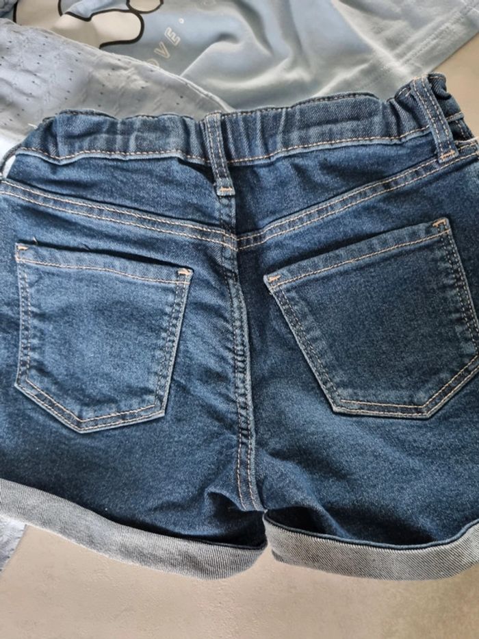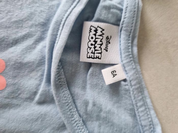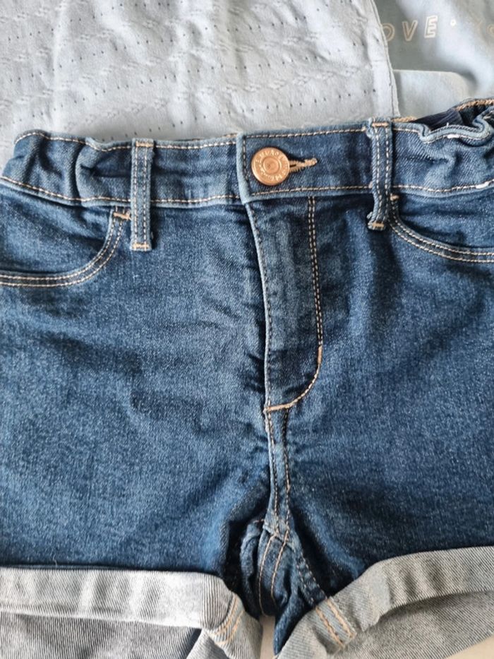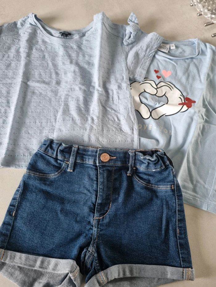 Look été fille. Short en jeans h&M taille 116cm Tee shirt ajouré bleu ciel kiabi taille 6 ans Tee shirt bleu ciel minnie disney taille 6 ans