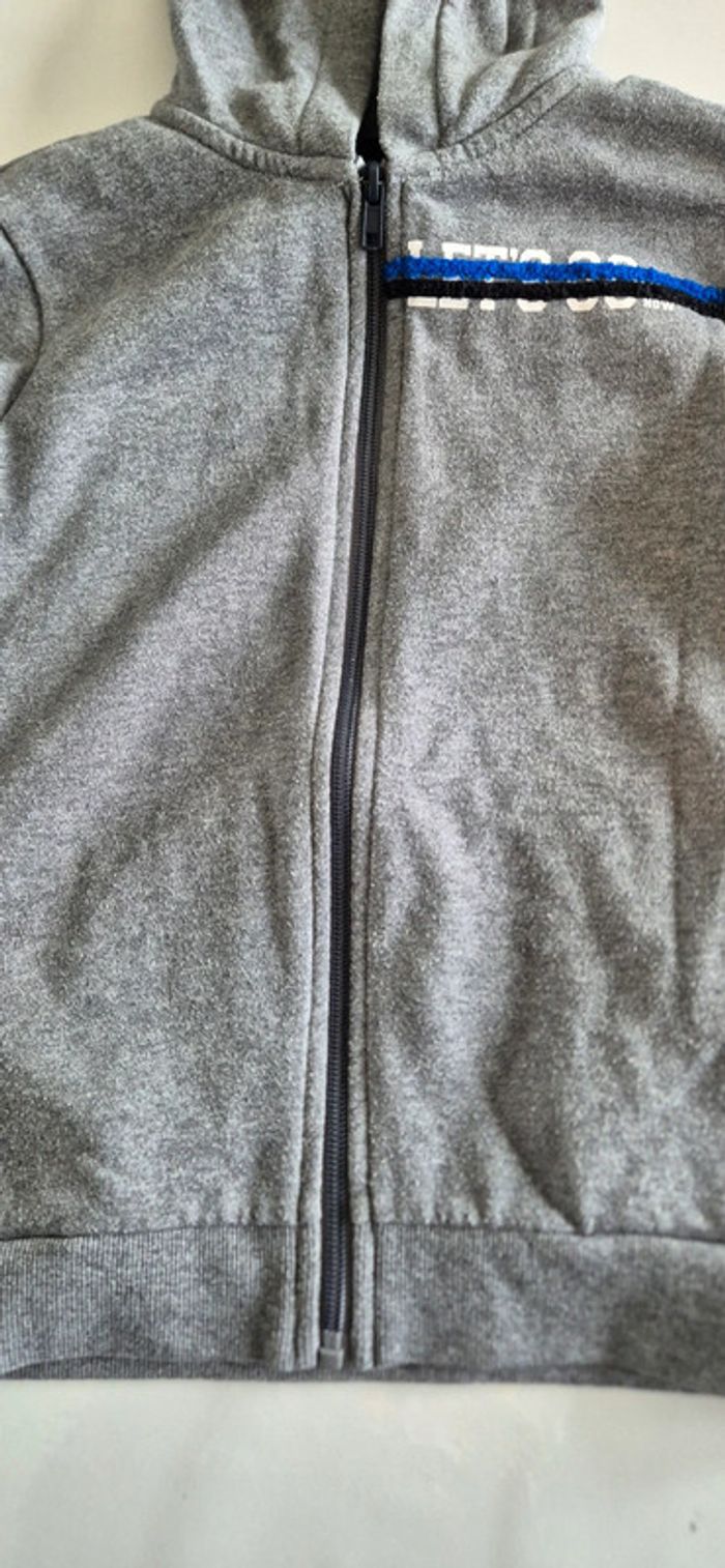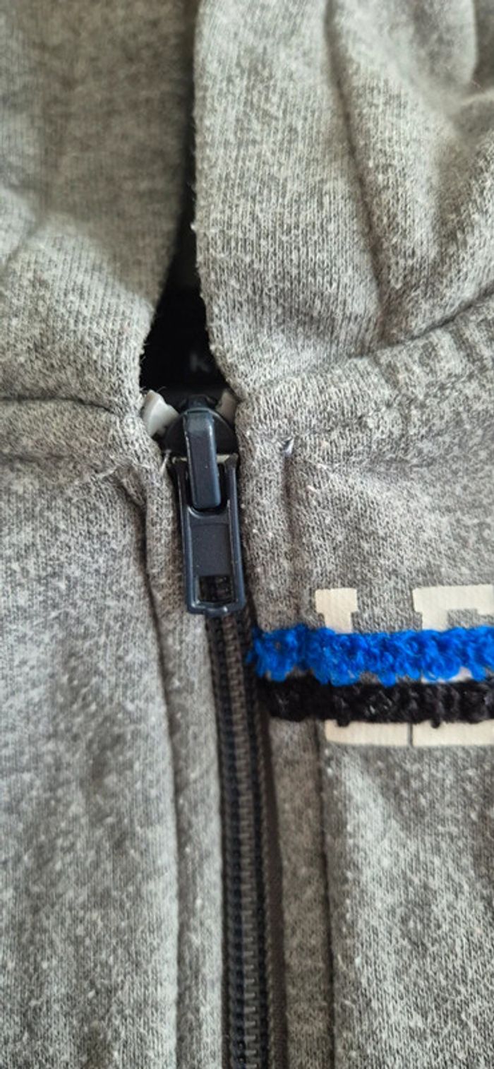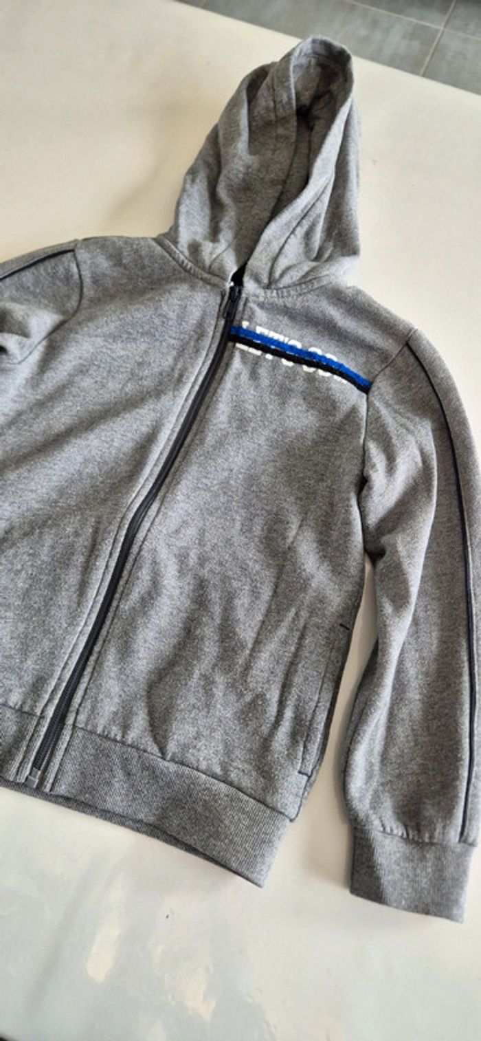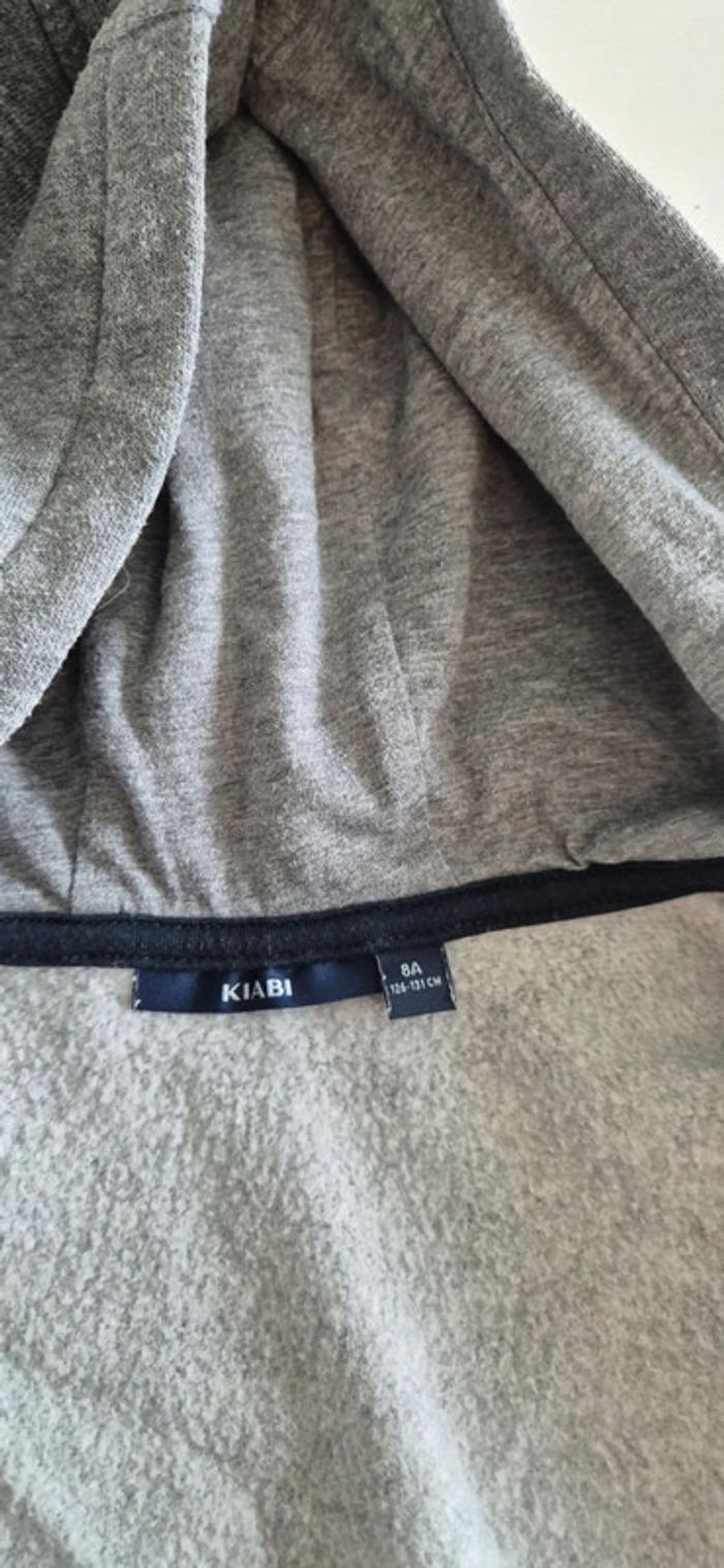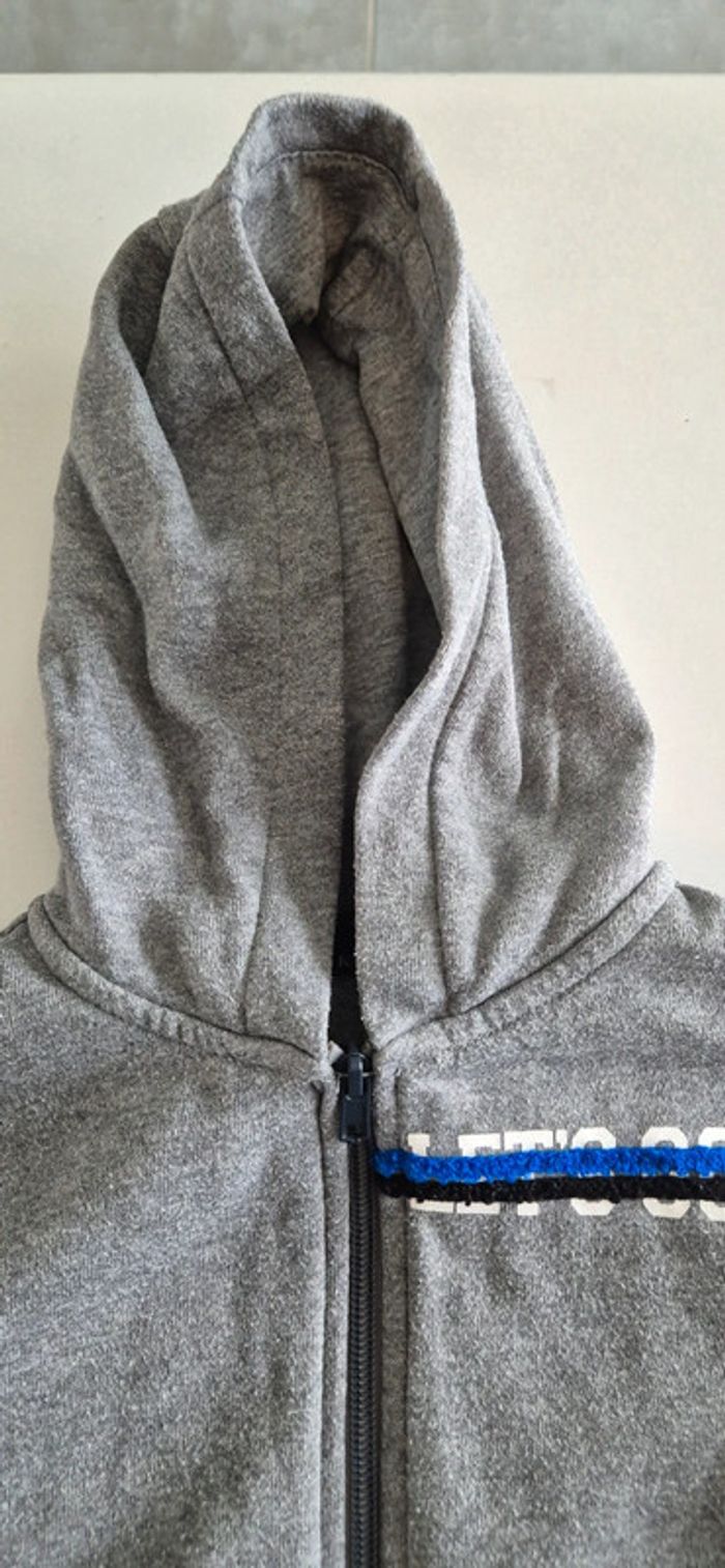 Veste à capuche style sweat. Kiabi 8 ans Gris motif bleu noir et blanc.