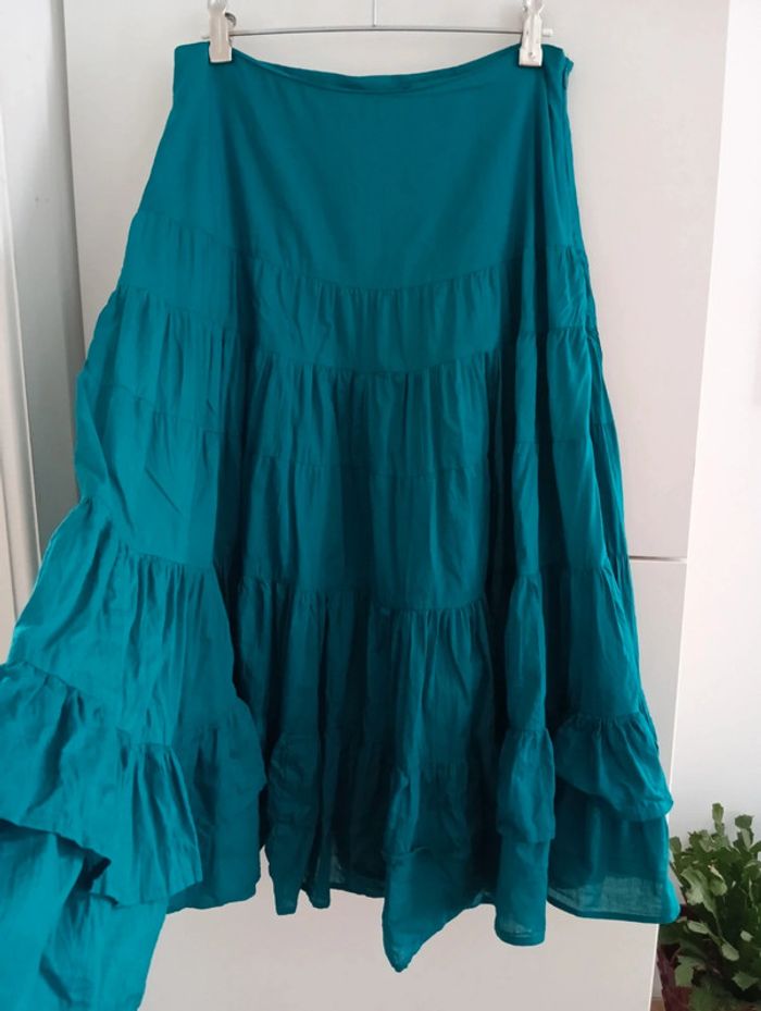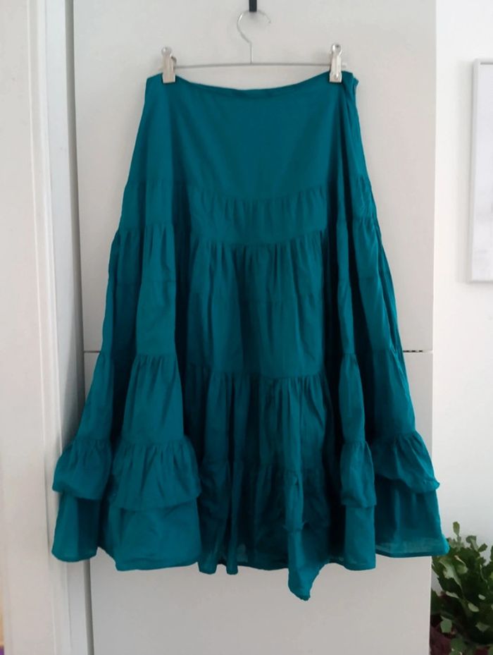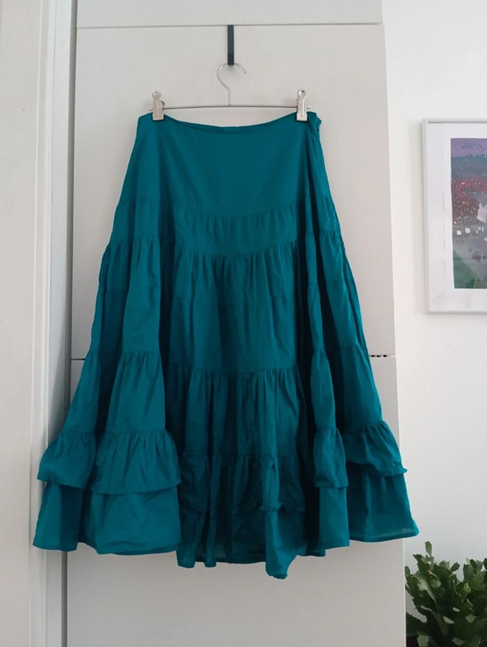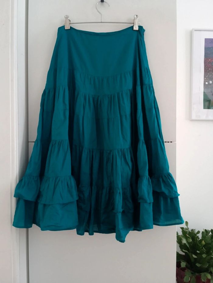 Jupe jupon vintage en coton turquoise Doublée Plusieurs niveaux de volants Taille 38 à confirmer avec les mesures Mesures Taille 36cm Longueur 74cm