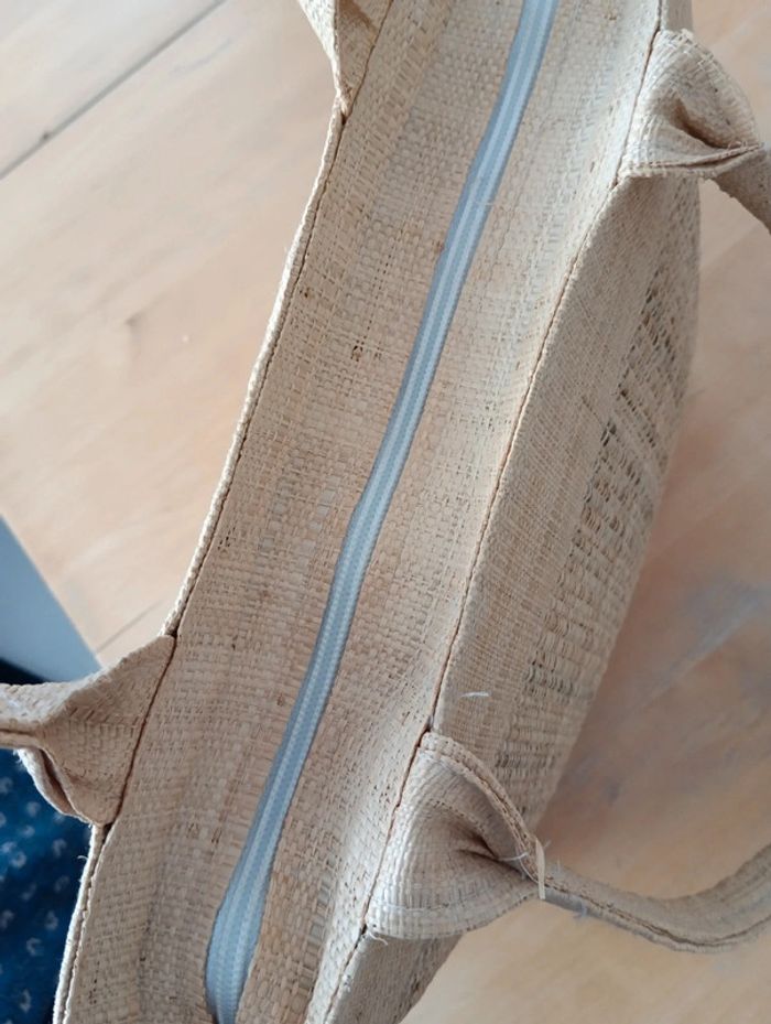 Petit panier vintage en raphia Fermeture éclair et petites anses Longueur 36cm Hauteur 22cm Hauteur anses 23cm Légère usure au niveau des coins.