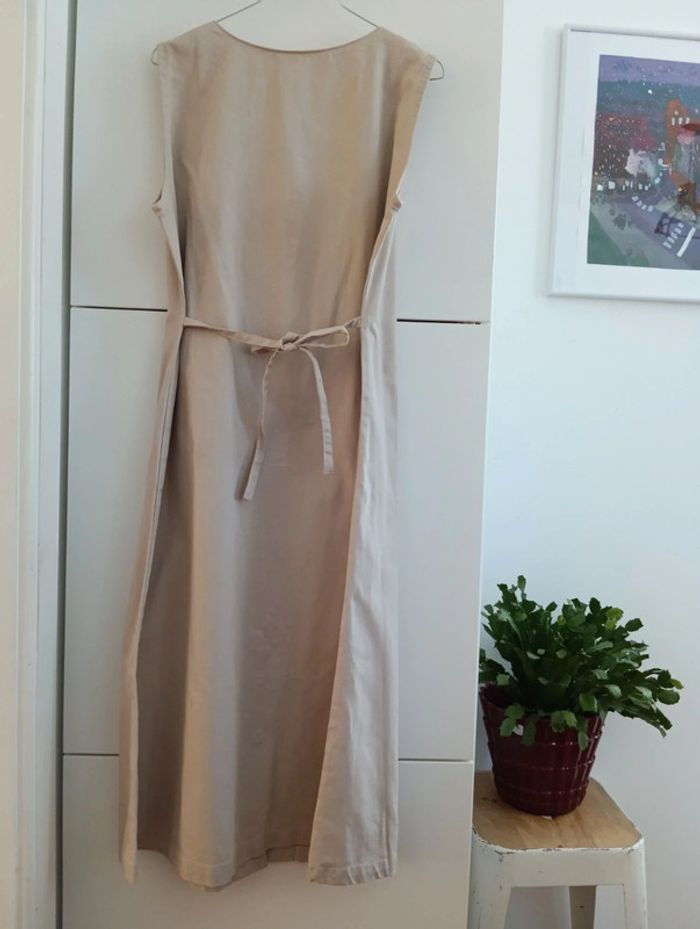 Robe beige boutonnée en coton taille 44 indiquée à confirmer avec les mesures Epaules 38cm Aisselles 56cm Longueur 116cm Lien au dos pour ajuster la taille