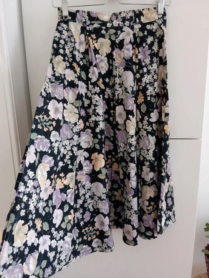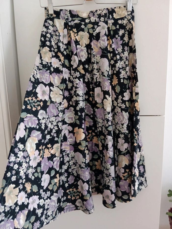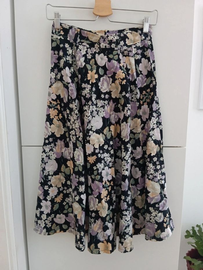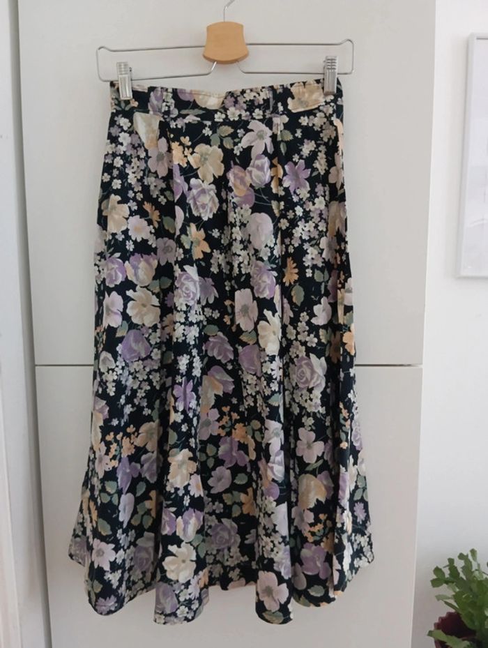 Jupe vintage à fleurs longueur midi en coton Taille 34/36 estimée à confirmer avec les mesures Fermeture par 2 pressions et velcro Taille 33cm Longueur 71cm