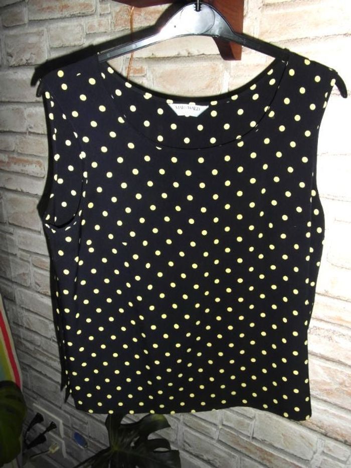 sans manches T40 bleu marine à pois jaune - polyester épaules 40 cm ; aisselles 48 cm ; longueur 59 cm