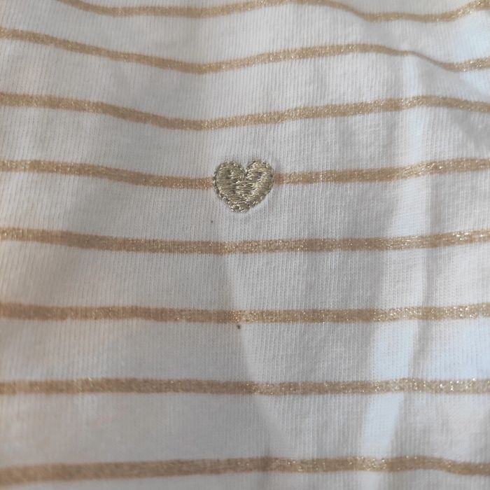 Roche blanche a manche courte de Kiabi, taille 12mois a rayures dorée brillant, un petit coeur dorée en haut, un noeud pour faire ceinture