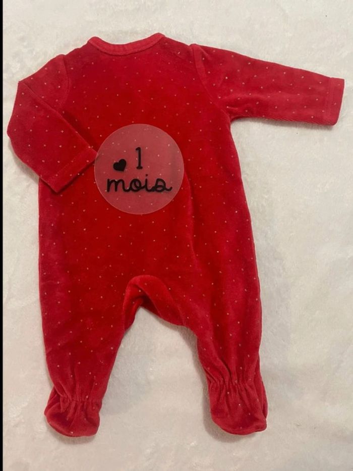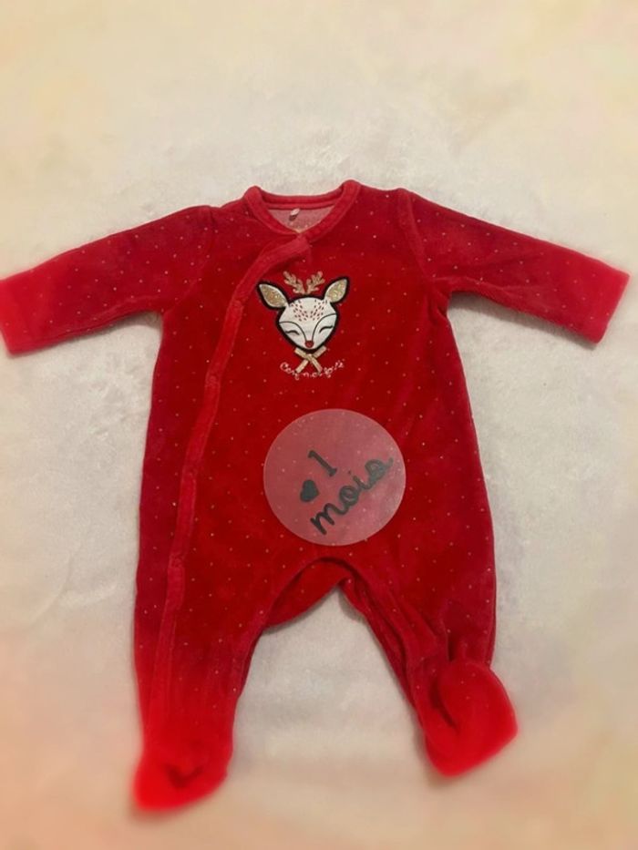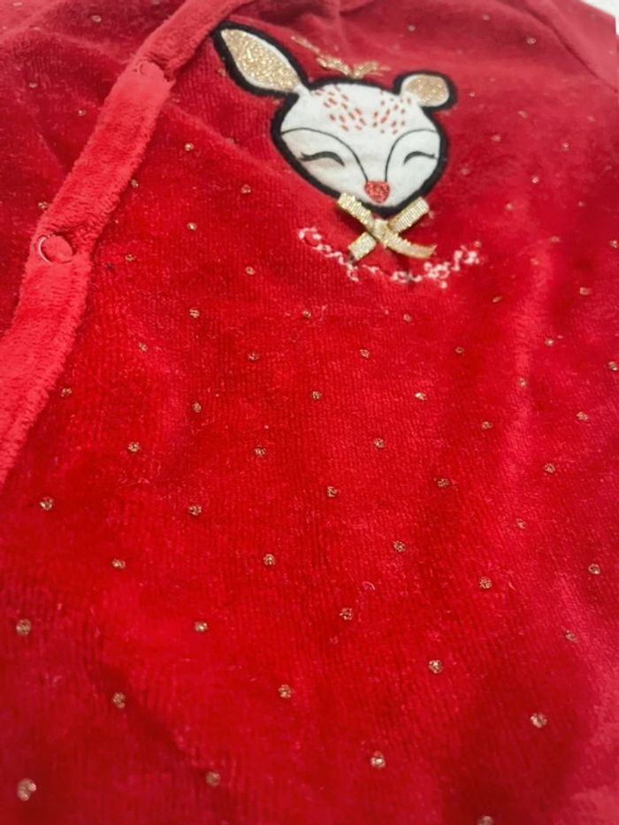 Pyjama rouge pailletée, brillant , scintillant or Avec une tête cerfs Idéale pour dormir pendant les fêtes de fin d’années , Noël … En excellent état , servis 1/2 fois Orchestra 1 mois #saadia_dlm_bébéfille_1mois
