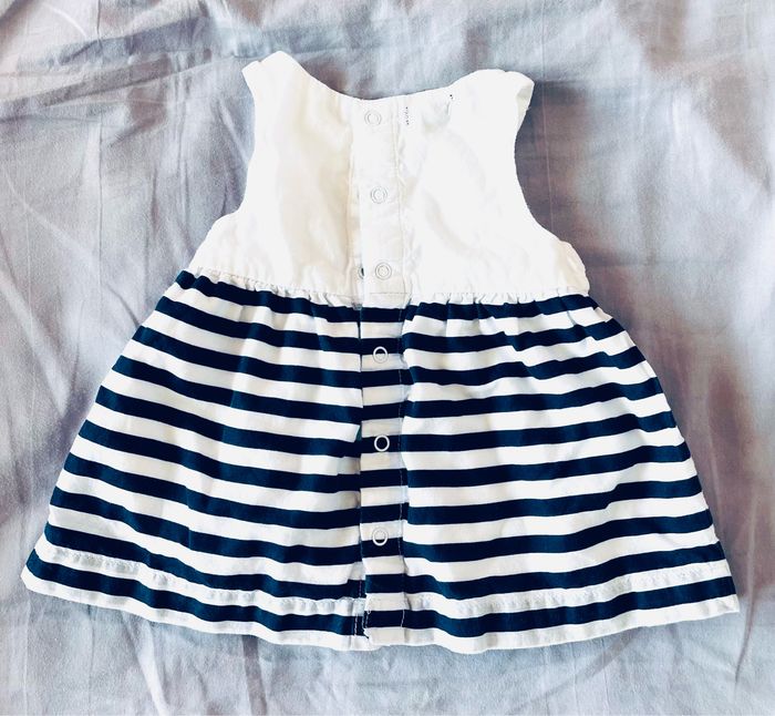 Vends robe sans manche « Kiabi » taille 1 mois. Ouverture dans le dos avec boutons pressions sur toute la longueur de la robe. Marinière blanche et bleu sur le bac de la robe avec petit noeud à la taille. Très bon état, très peu portée. Réduction sur les lots ✅