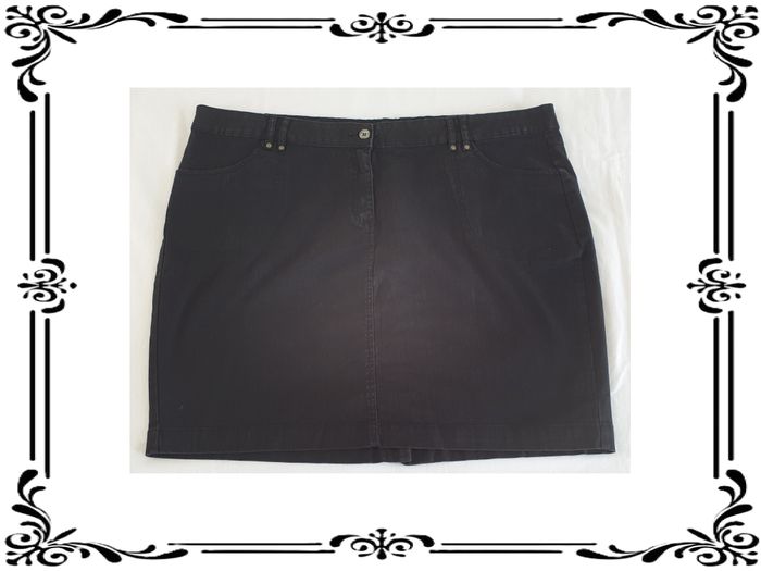 Jupe taille 54. Jupe courte en jean noire. Une grande poche chaque côté devant. Une fausse poche boutonnée chaque côté derrière. Fente derrière sur 11,5 cm. Tissu extensible sur 3 cm. 98 % coton, 2% élasthanne. Largeur à la taille : 56,5 cm Largeur de bassin : 62,5 cm Longueur totale : 54 cm En très bon état. La halle. 3€. #vero38110vetementsfemme54