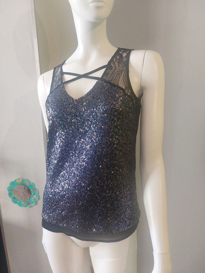 Débardeur à sequins taille XS de chez NafNaf en excellent état, comme neuf, peu porté, fait un jolie décolleté et la matière est agréable à porter N'hésitez pas à me contacter si vous avez des questions 😀