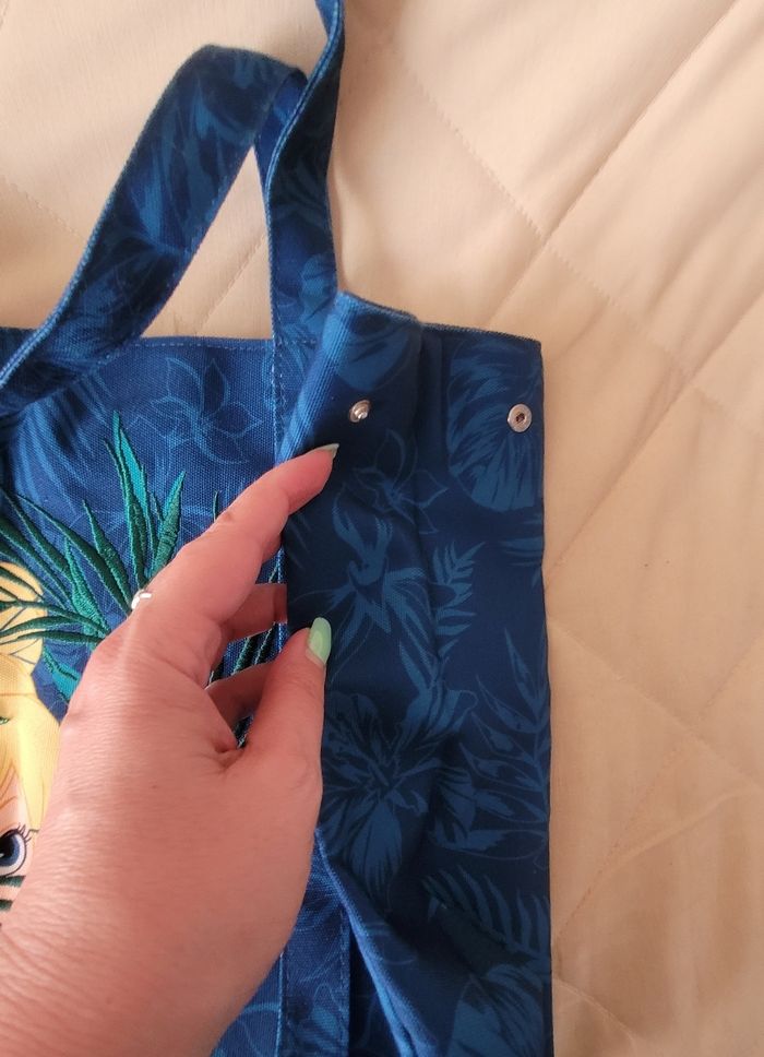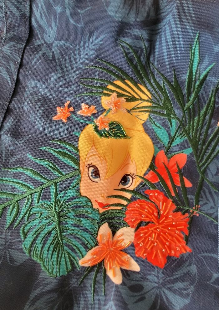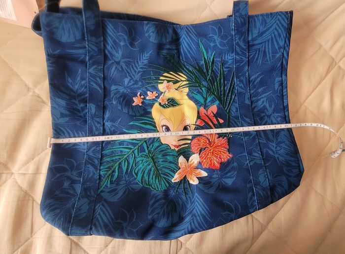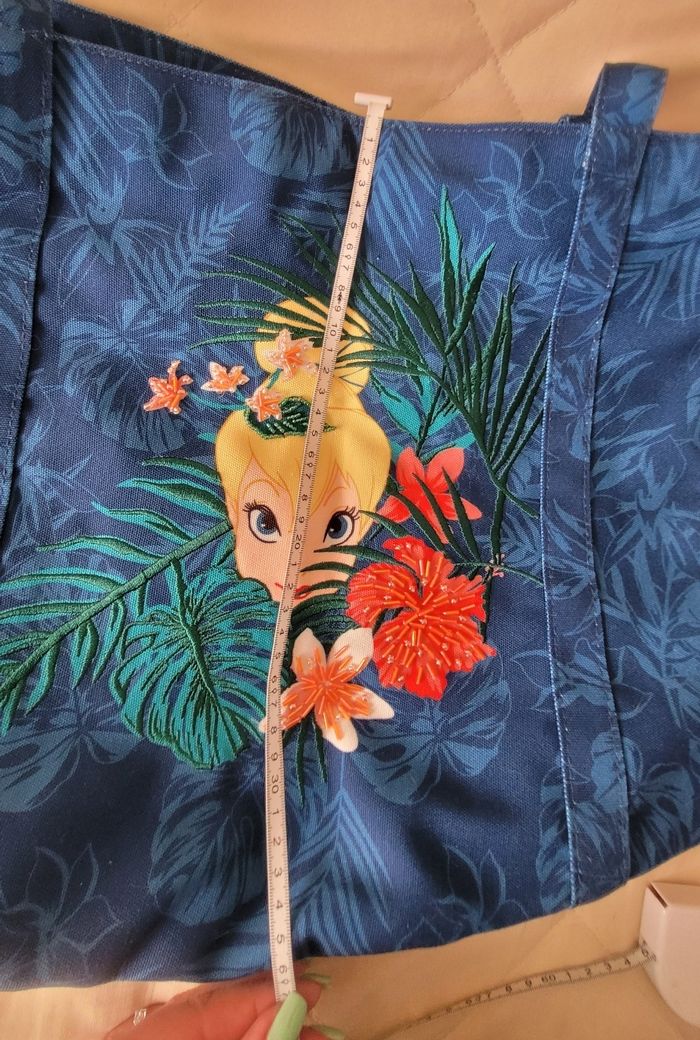 Joli sac cabas fée clochette, fermé par pression, poches à l'intérieur, pressions sur le côté qui permettent d'élargir le sac. Perles sur les fleurs. Environ 40 x 35 cm Produit Disneyland Paris #disneytattoogirl_3
